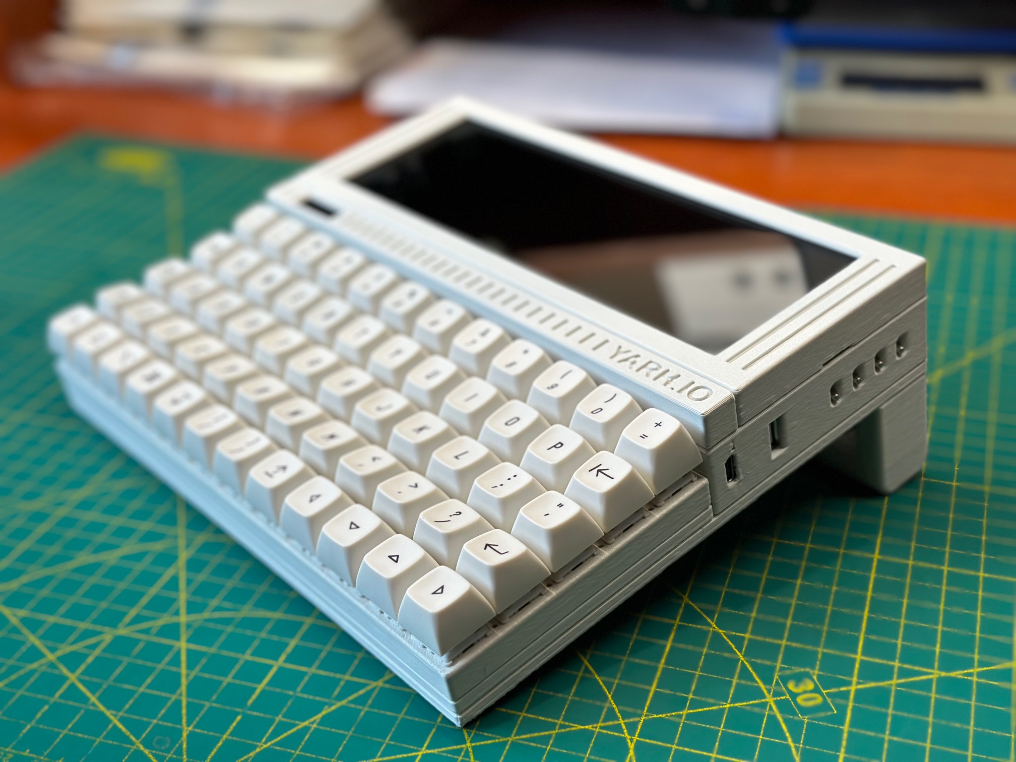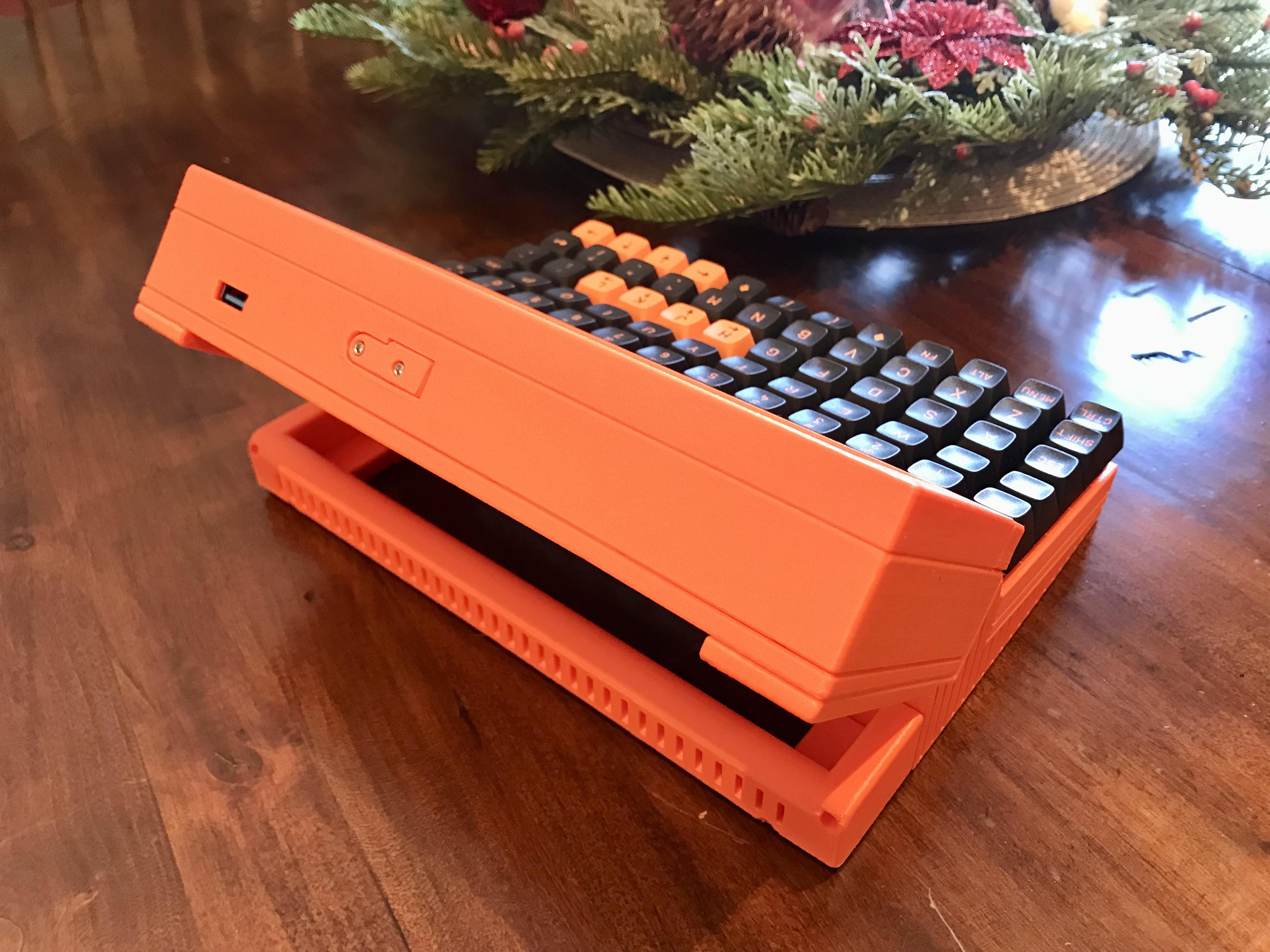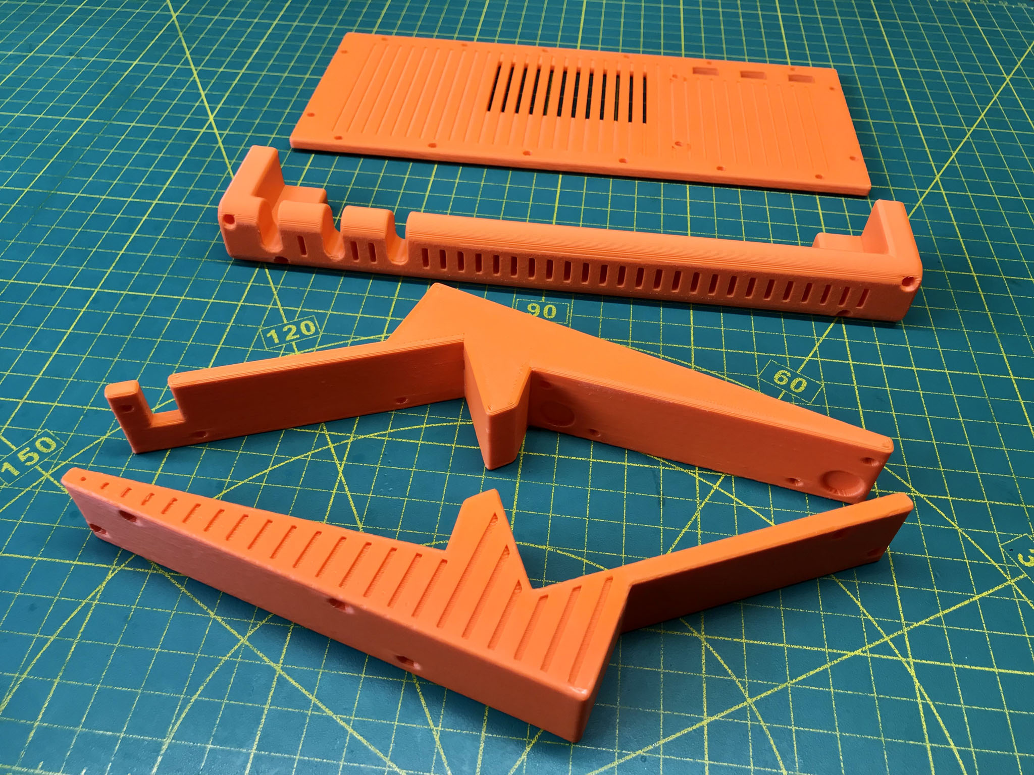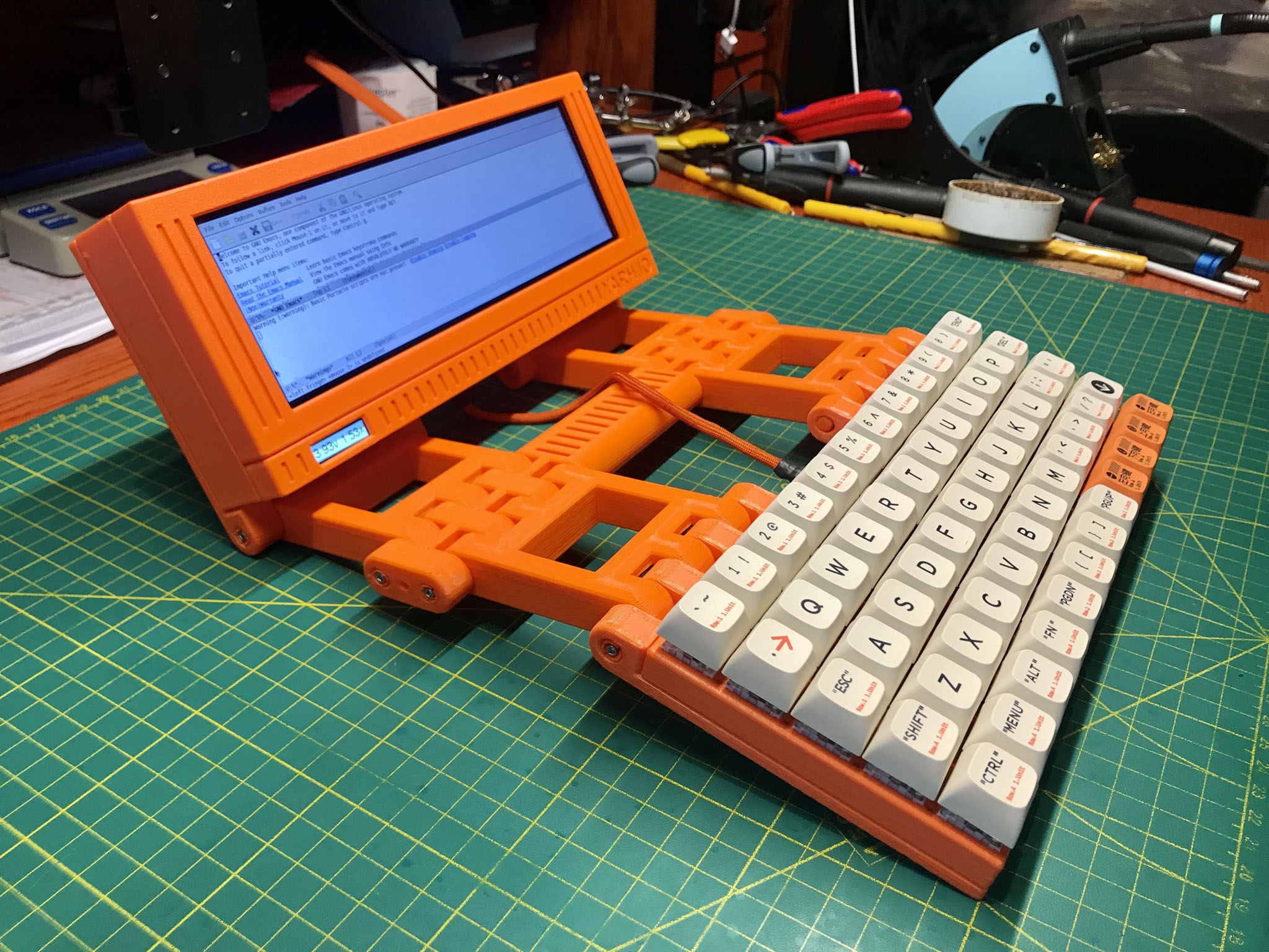 The keyboard is a 5×12 ortholinear layout — 60 keys in a uniform grid with Cherry-compatible mechanical switches and QMK firmware running on a Pro Micro controller. The ortholinear layout takes a day or two to get used to, but once your fingers learn the grid, the consistency is hard to go back from. QMK gives you full control over layers, macros, and key behavior. What makes the design modular is the carrier system: the keyboard connects to the main unit through interchangeable 3D-printed carriers that transform the device into different configurations — a laptop-style Terminal, a flat Cyberdeck, or a convertible Transformer with adjustable viewing angles. All enclosure parts are printed in PLA or ASA and held together with machine screws, so anything that breaks or wears out can be reprinted and replaced in an afternoon.