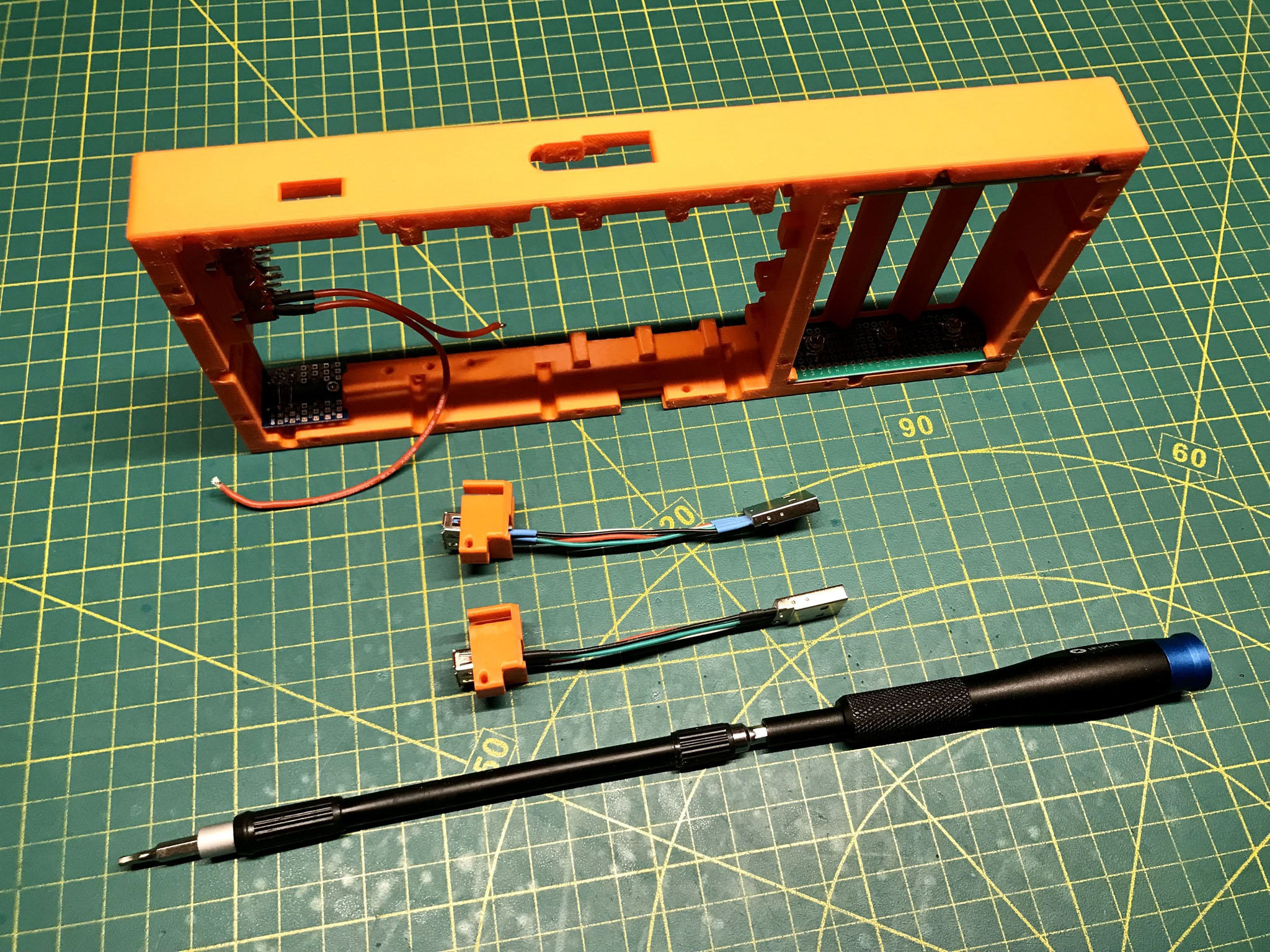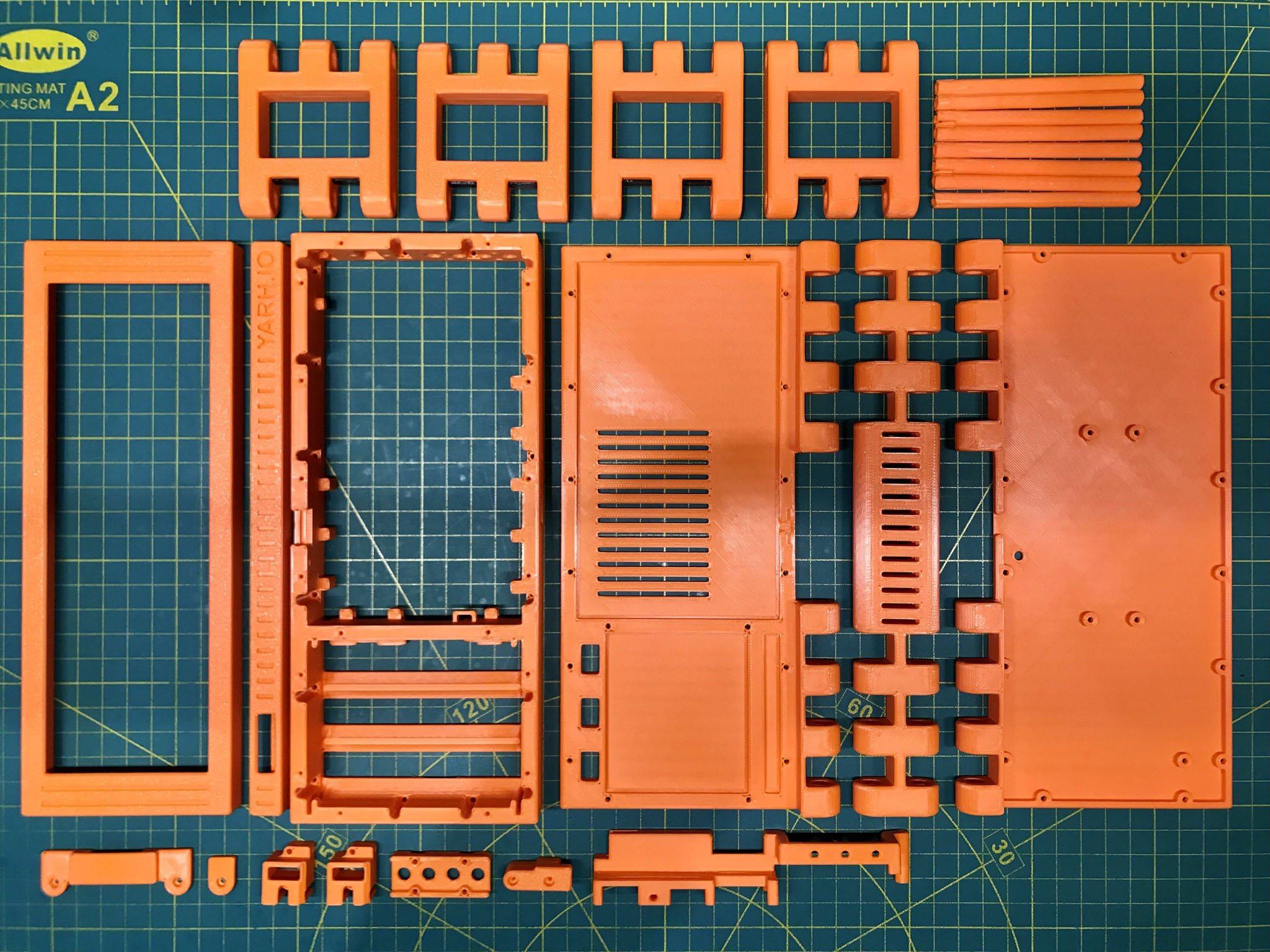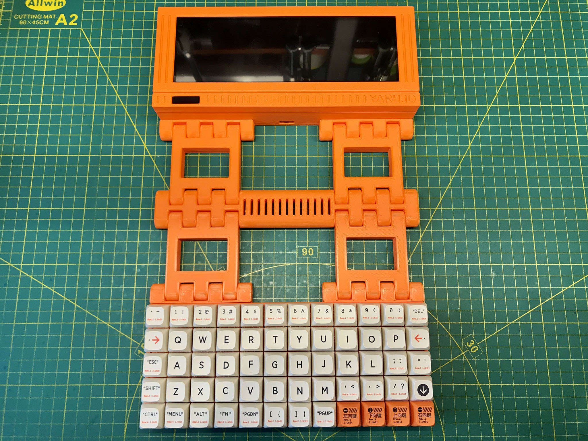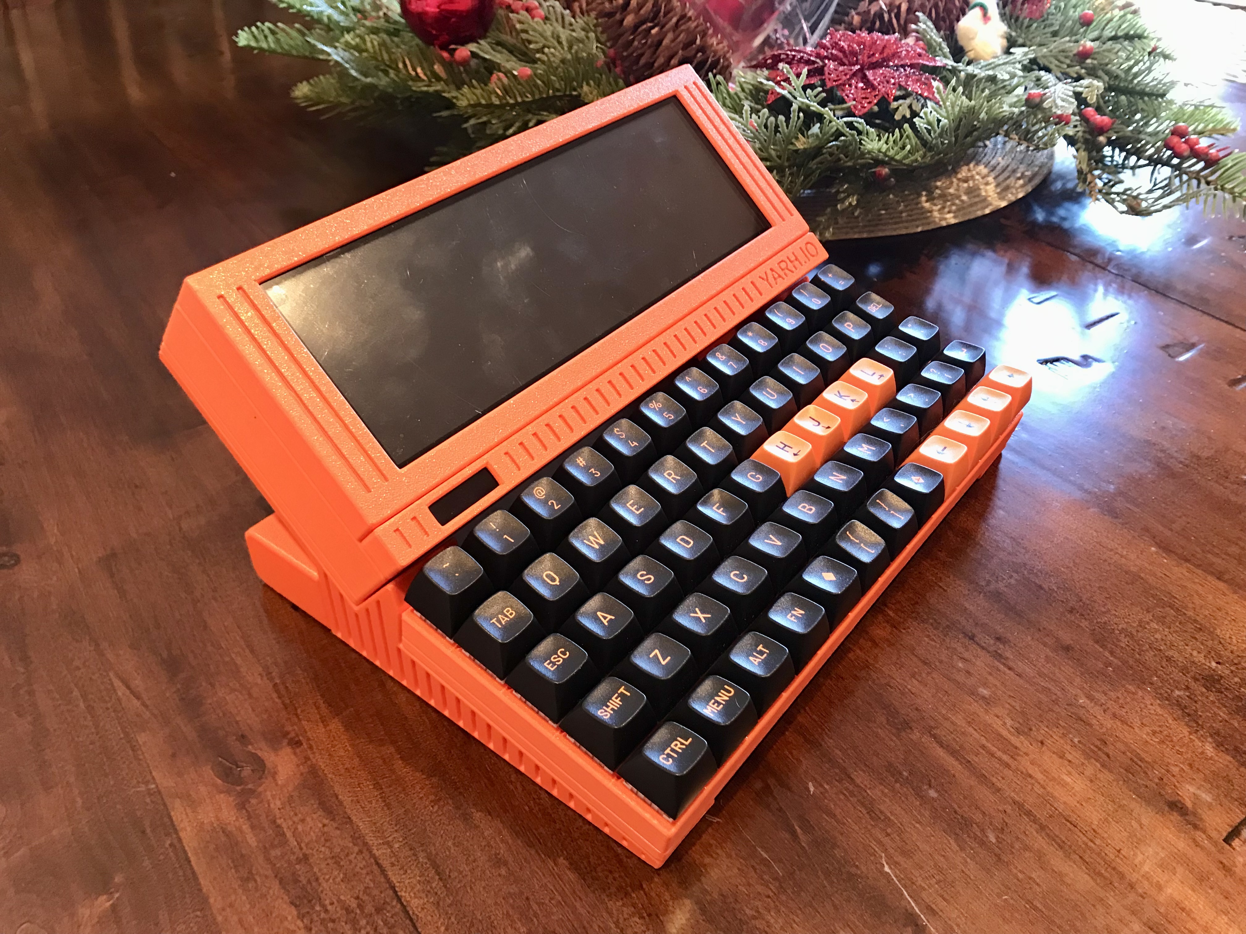 The keyboard is a 5×12 ortholinear layout — 60 keys in a uniform grid with Cherry-compatible mechanical switches and QMK firmware running on a Pro Micro controller. The ortholinear layout takes a day or two to get used to, but once your fingers learn the grid, the consistency is hard to go back from. QMK gives you full control over layers, macros, and key behavior. What makes the design modular is the carrier system: the keyboard connects to the main unit through interchangeable 3D-printed carriers that transform the device into different configurations — a laptop-style Terminal, a flat Cyberdeck, or a convertible Transformer with adjustable viewing angles. All enclosure parts are printed in PLA or ASA and held together with machine screws, so anything that breaks or wears out can be reprinted and replaced in an afternoon.