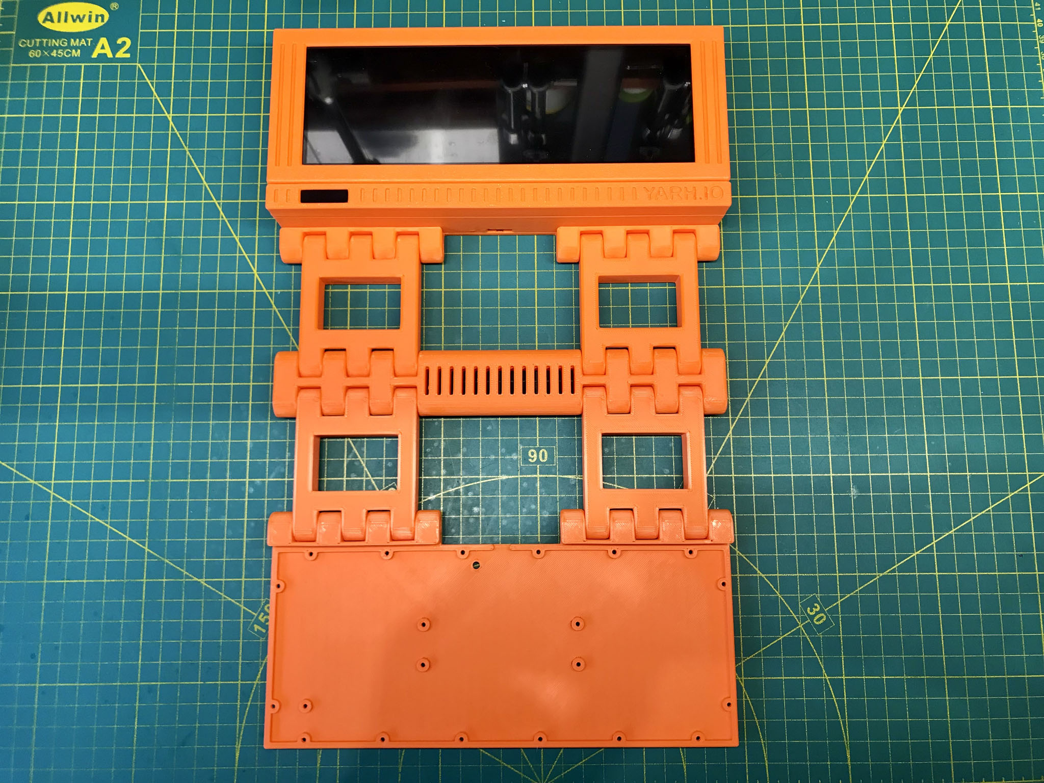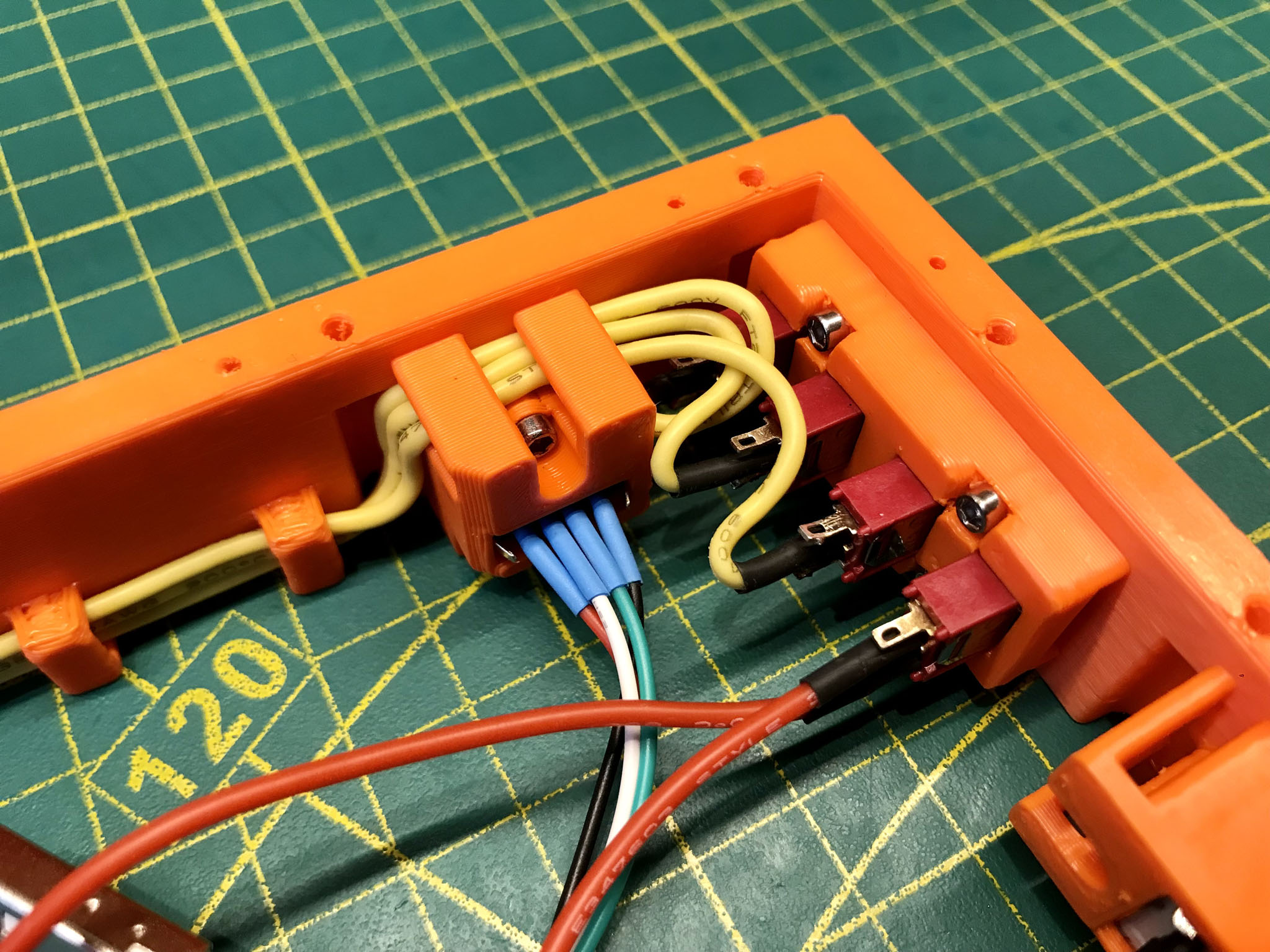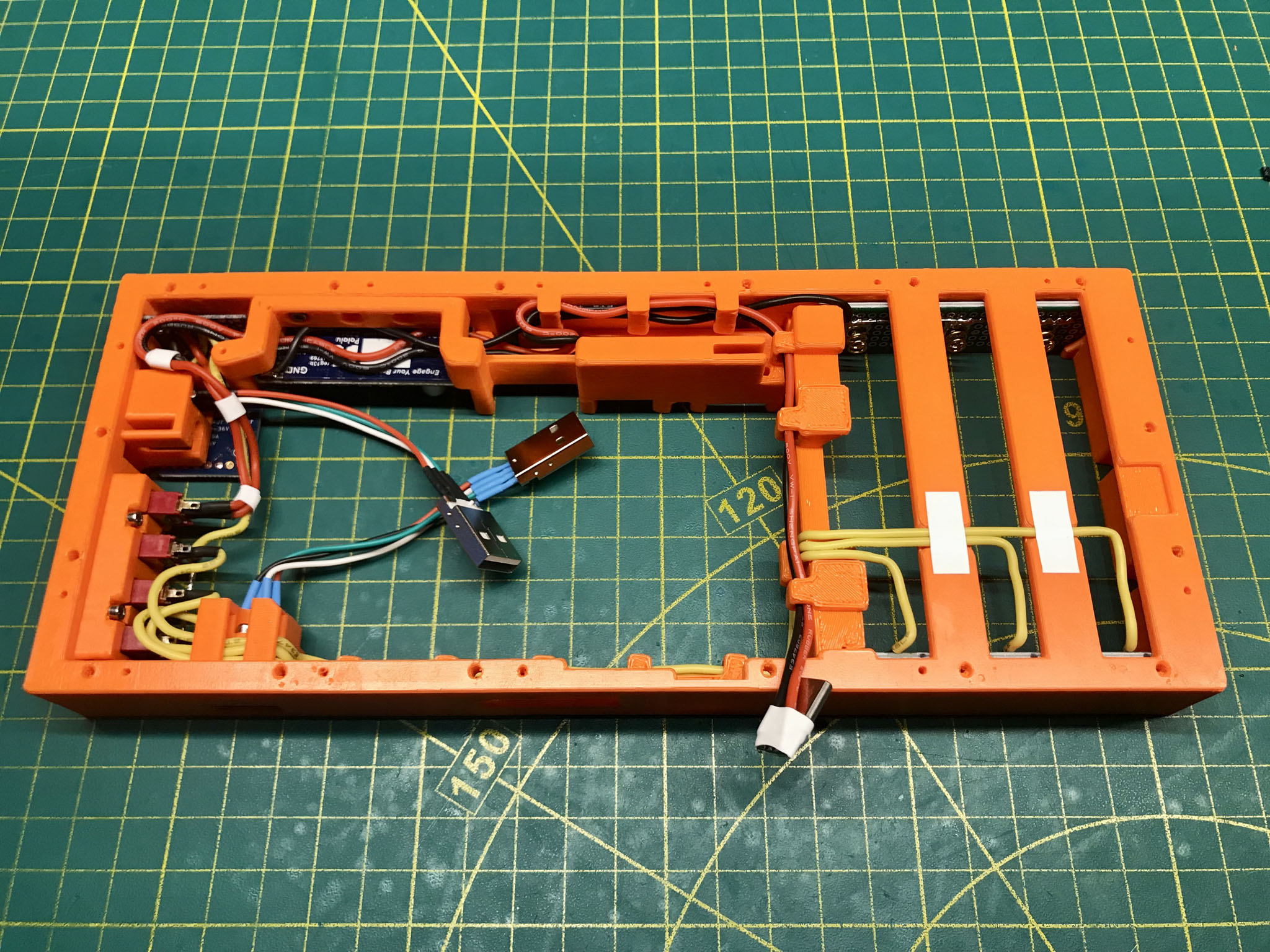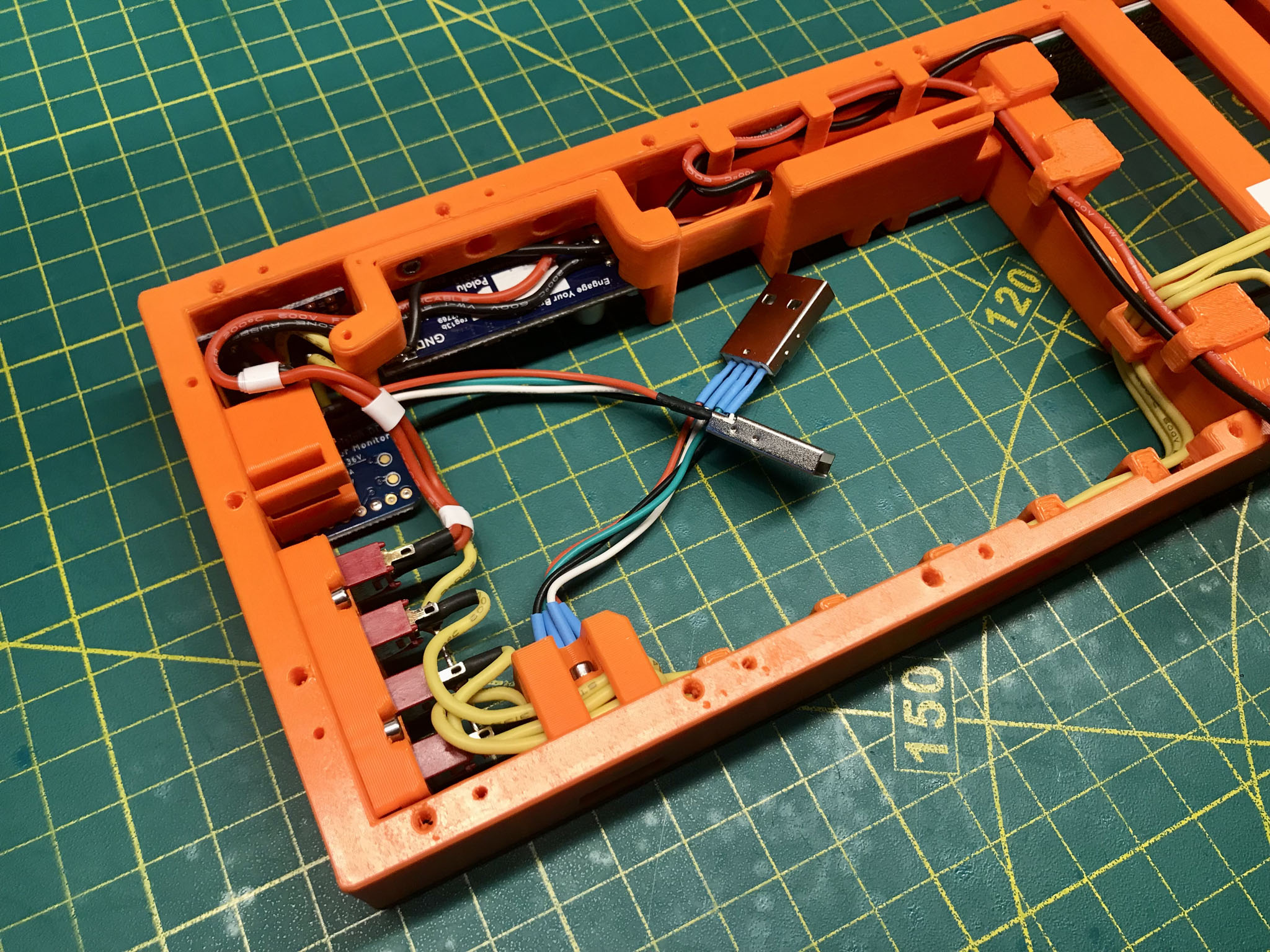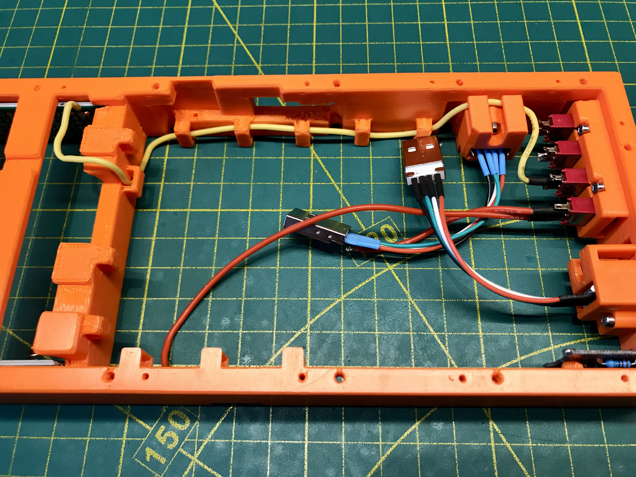The keyboard is a 5×12 ortholinear layout — 60 keys in a uniform grid with Cherry-compatible mechanical switches and QMK firmware running on a Pro Micro controller. The ortholinear layout takes a day or two to get used to, but once your fingers learn the grid, the consistency is hard to go back from. QMK gives you full control over layers, macros, and key behavior. What makes the design modular is the carrier system: the keyboard connects to the main unit through interchangeable 3D-printed carriers that transform the device into different configurations — a laptop-style Terminal, a flat Cyberdeck, or a convertible Transformer with adjustable viewing angles. All enclosure parts are printed in PLA or ASA and held together with machine screws, so anything that breaks or wears out can be reprinted and replaced in an afternoon.