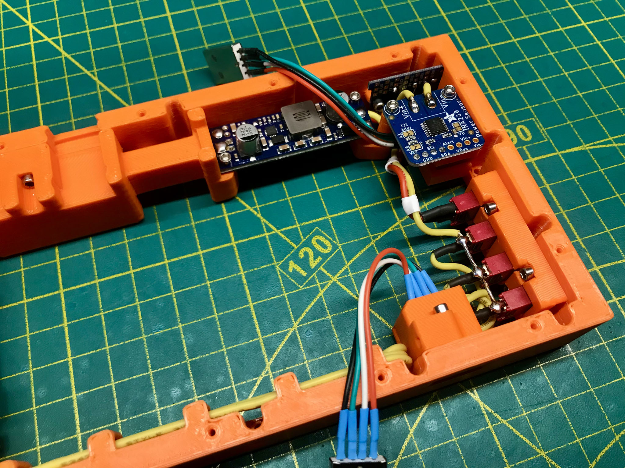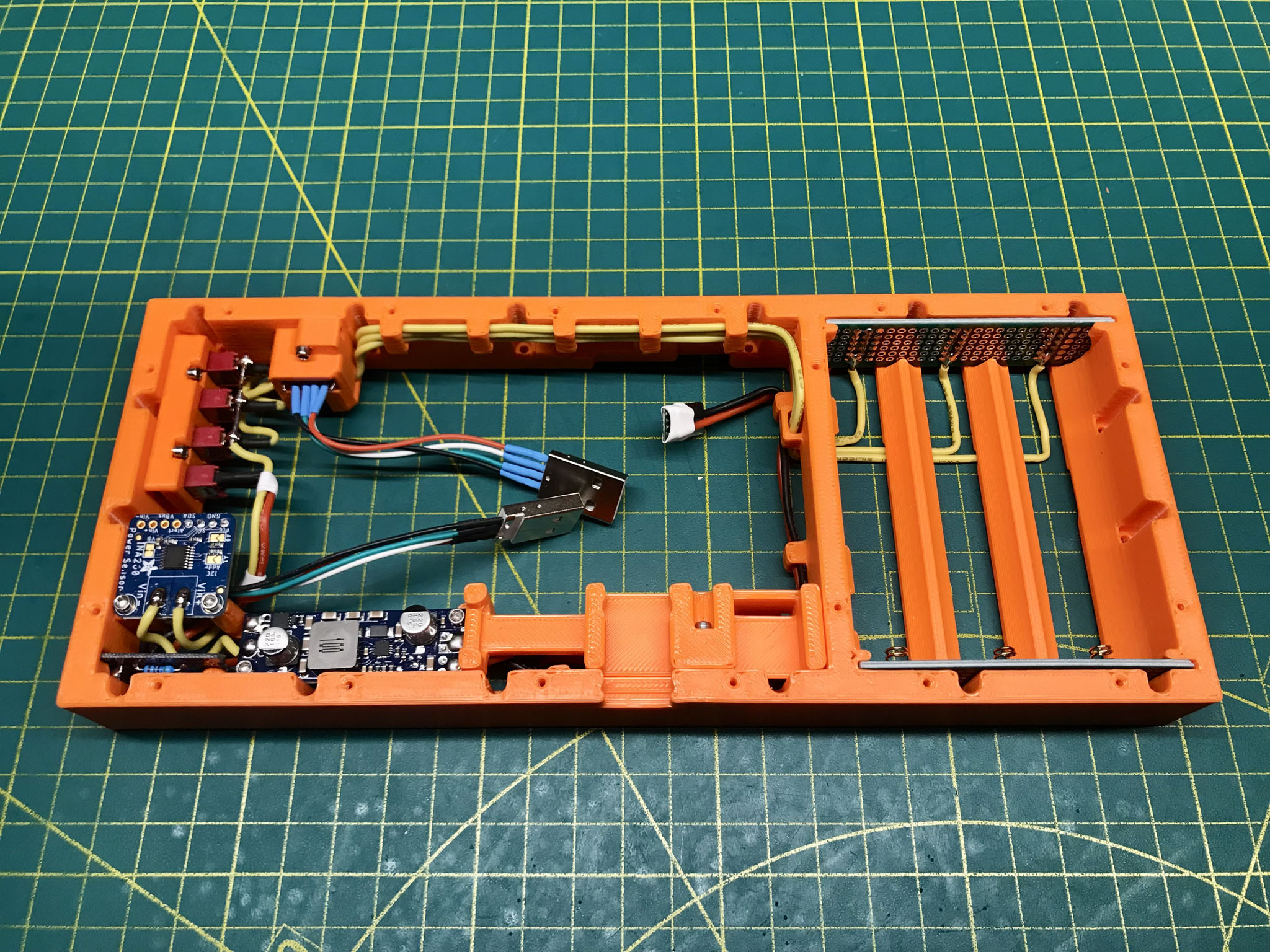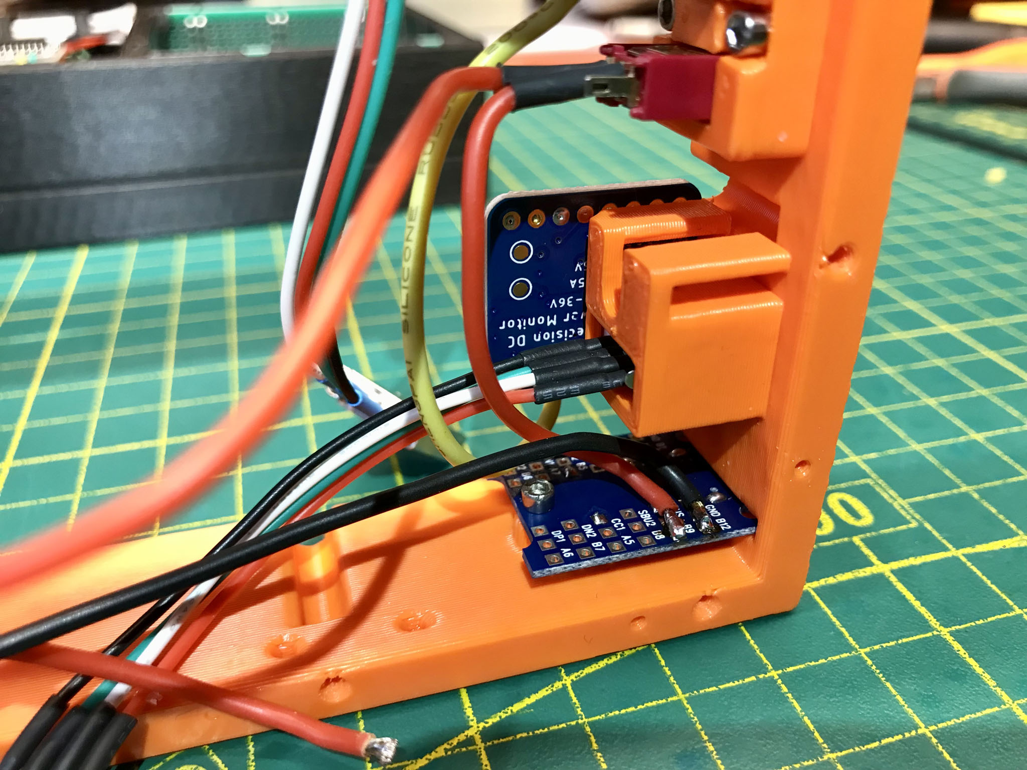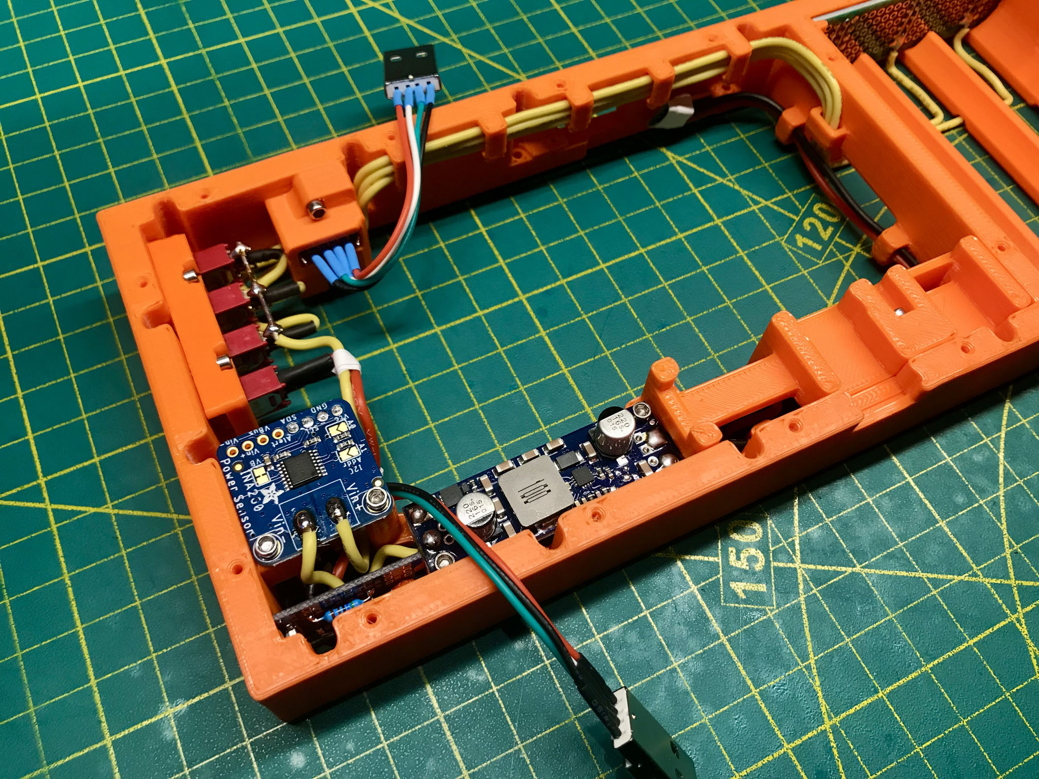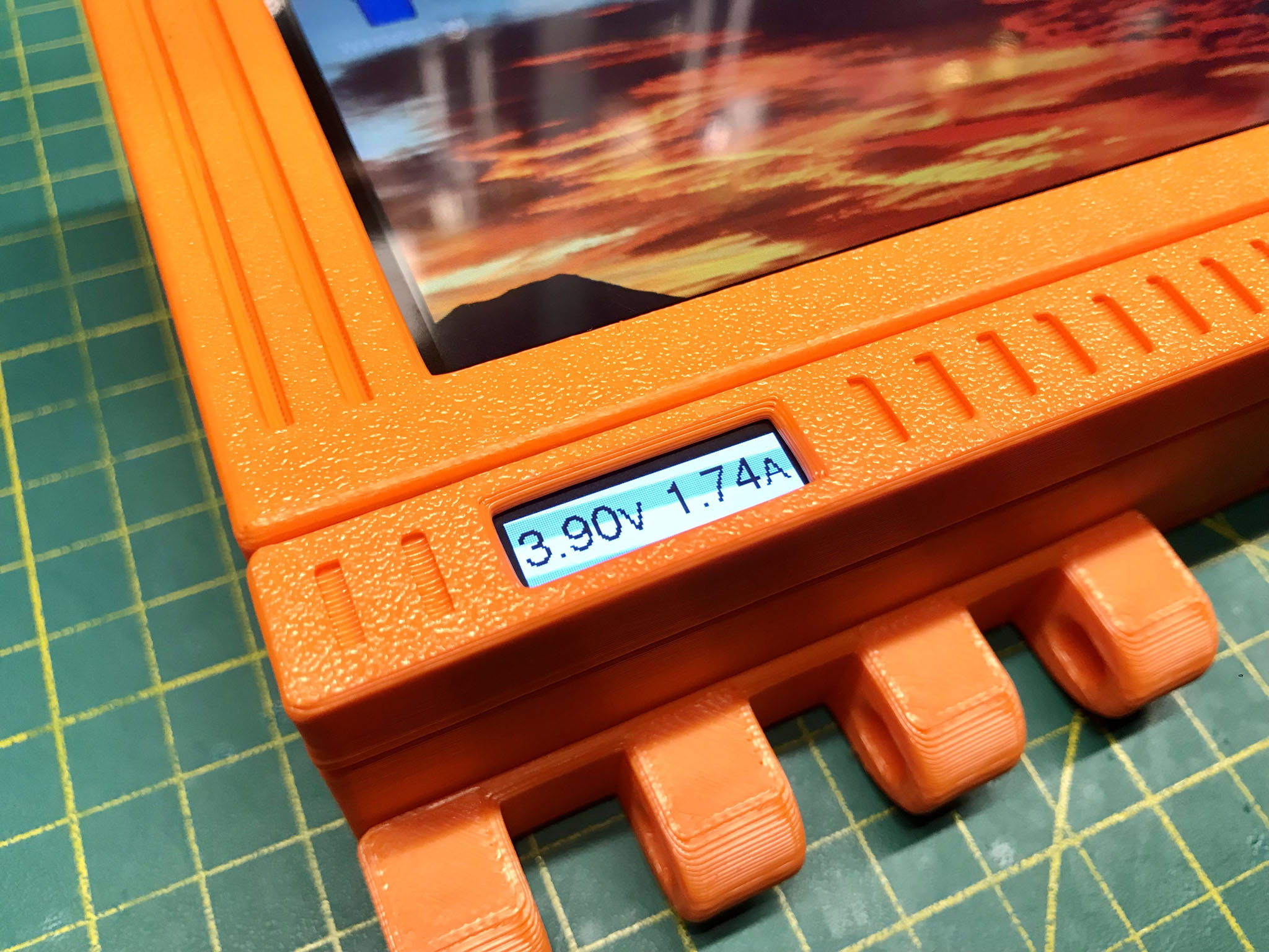 Knowing your battery state matters when you're working away from a power outlet, so THEBRICK has a dedicated monitoring system on the front panel. An Adafruit INA260 high-side current and voltage sensor feeds real-time data to a Pimoroni Tiny 2040 microcontroller, which processes the readings and pushes them to a 0.91-inch 128×32 OLED display. You can see voltage, current draw, and estimated remaining capacity at a glance without opening any software. The Tiny 2040 runs custom firmware that's straightforward to modify — change the display format, add calculated fields, or adjust the refresh rate to suit your preferences.