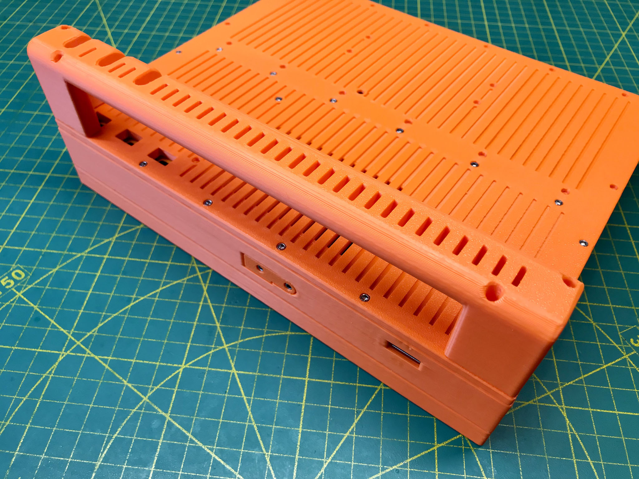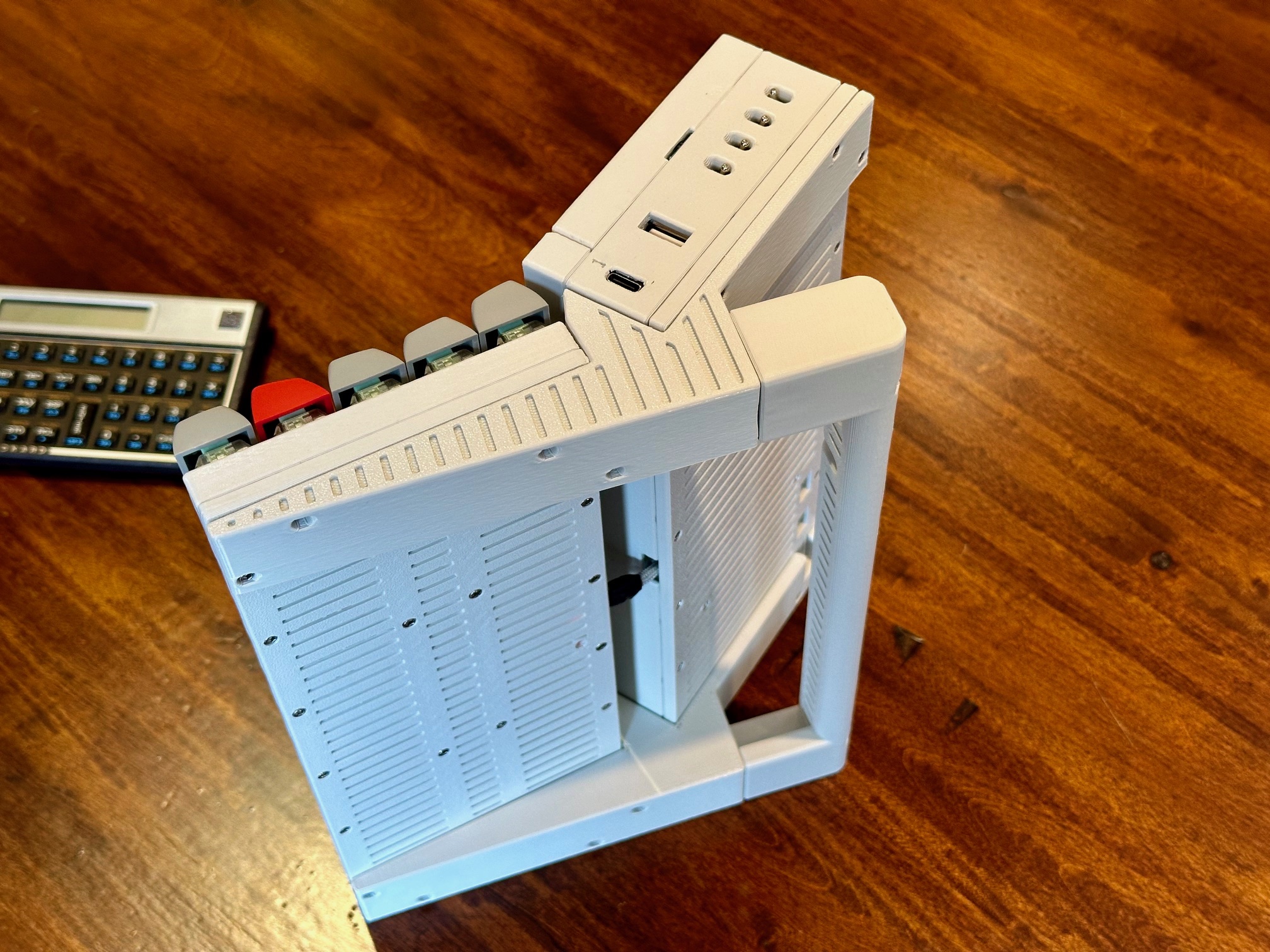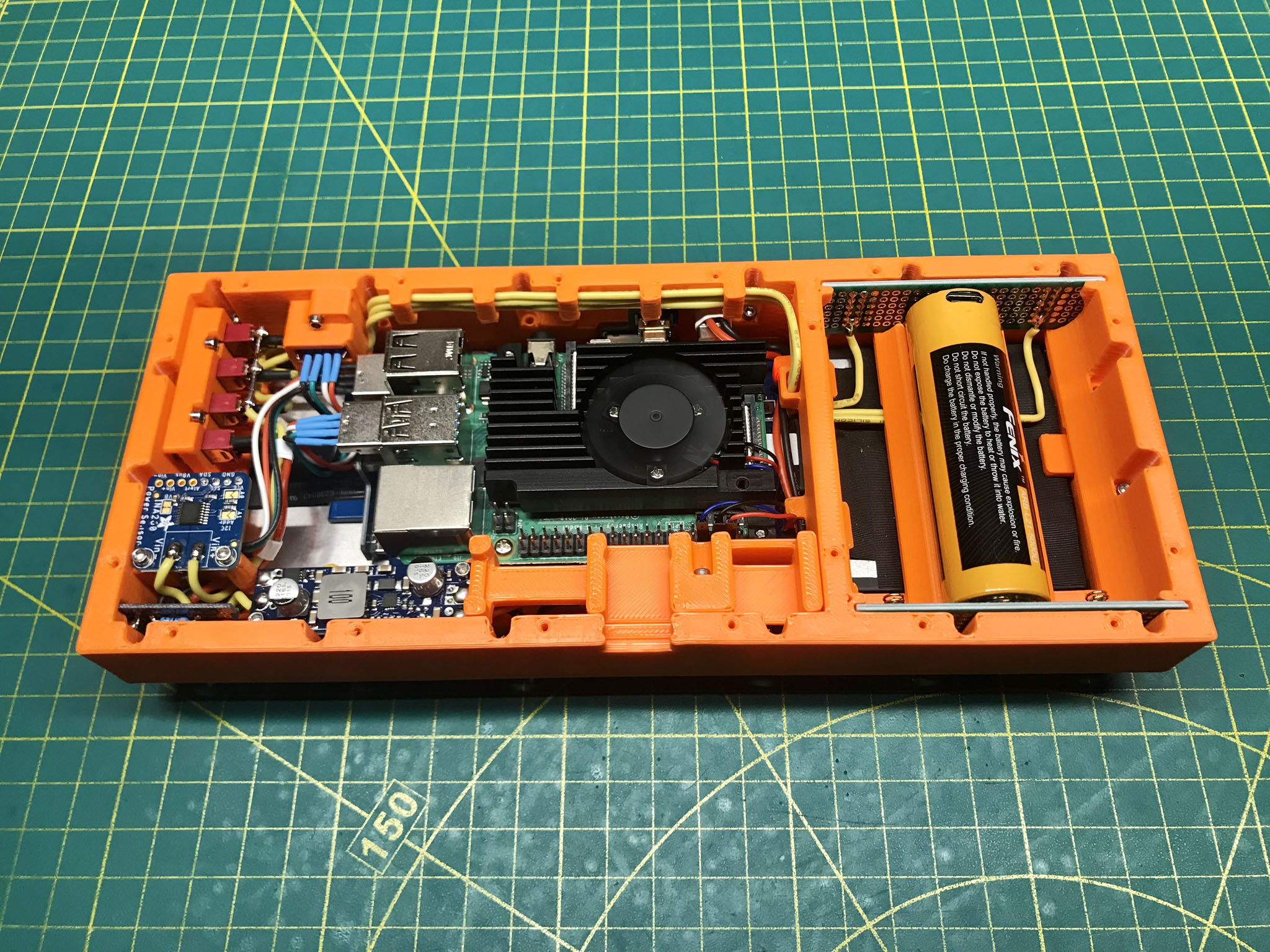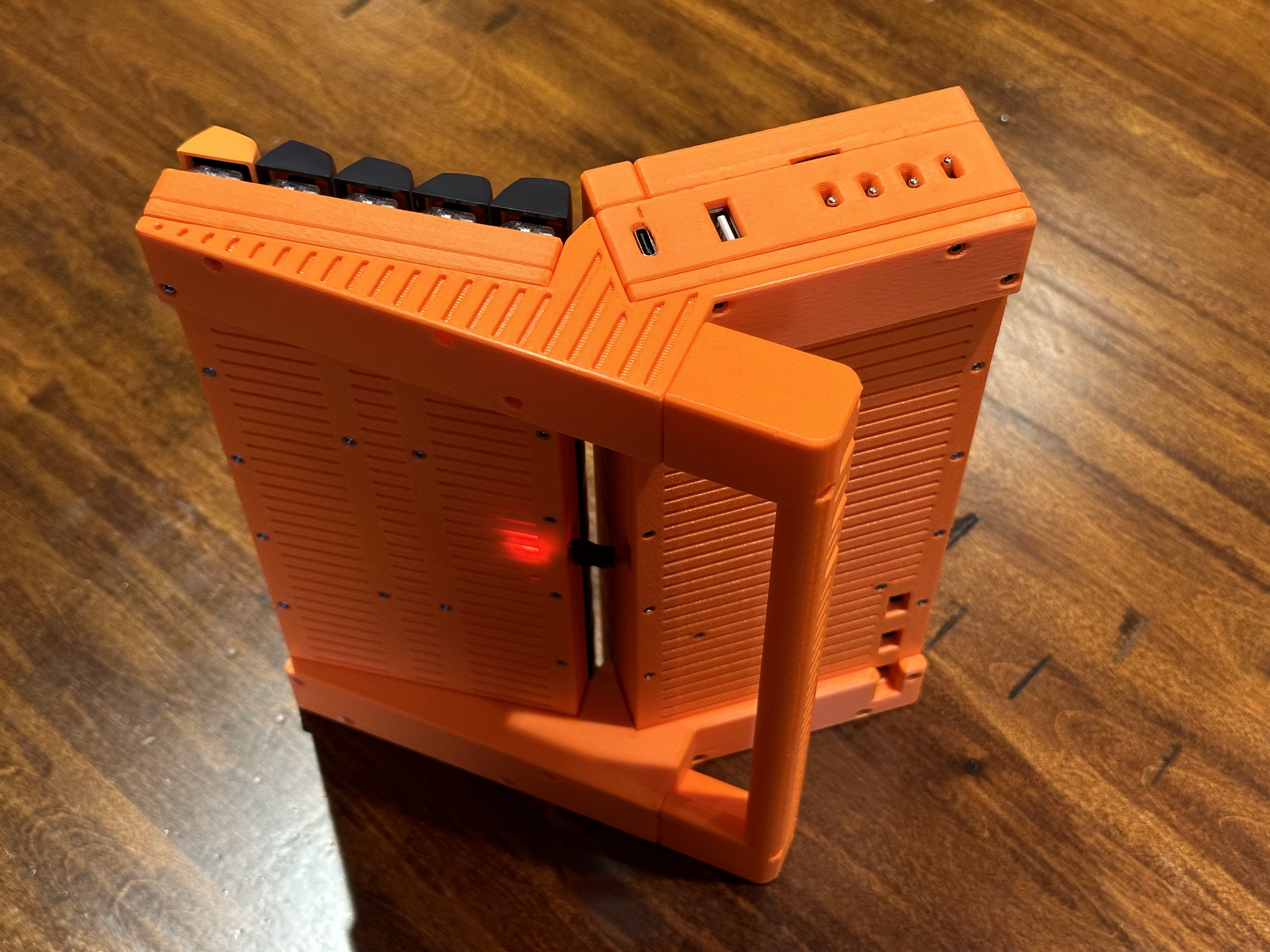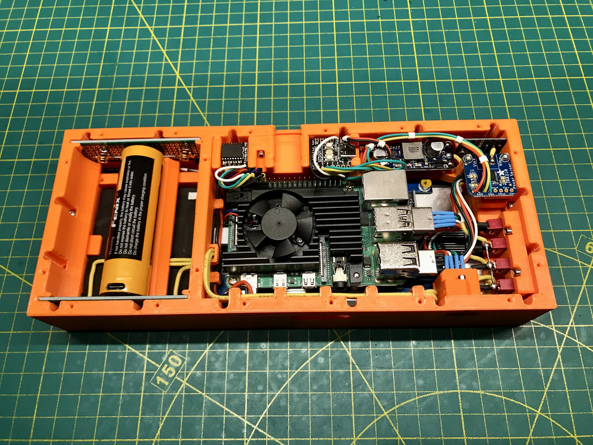 Power was one of the hardest problems to solve well. THEBRICK carries three Fenix ARB-L21-5000U 21700 lithium cells — real, high-quality batteries with built-in USB-C charging. A Pololu U3V50F5 step-up regulator converts the battery voltage to a stable 5V output, working reliably from inputs as low as 2.9V, which means the Pi keeps running until the cells are genuinely depleted. Each battery has its own ON/OFF toggle switch on the right panel and a dedicated USB-C charging port on the rear. You can run on a single cell or engage multiple for extended sessions. Plug in a charger while the device is running and it effectively becomes a UPS — no interruption, no shutdown, just keep working.