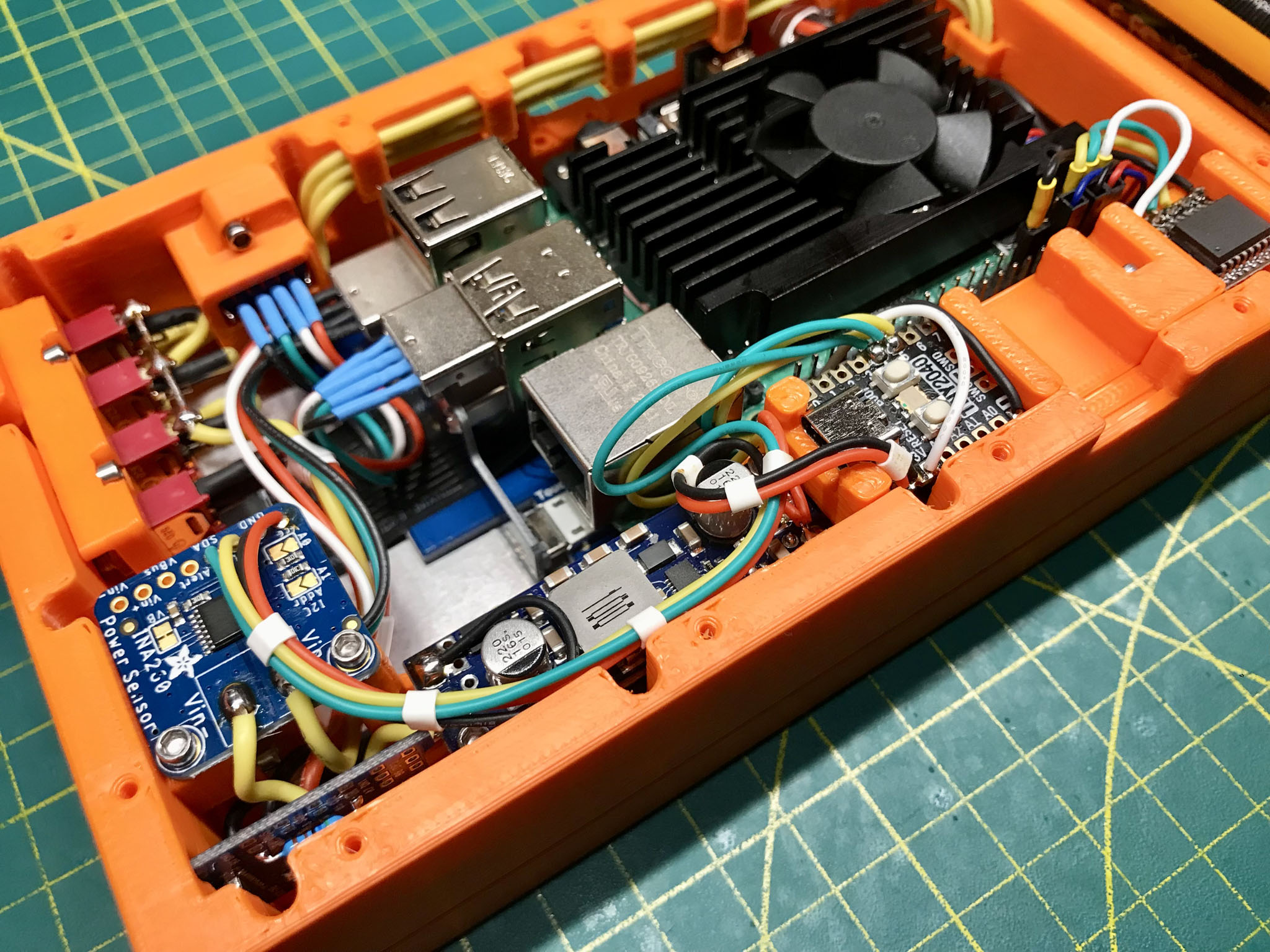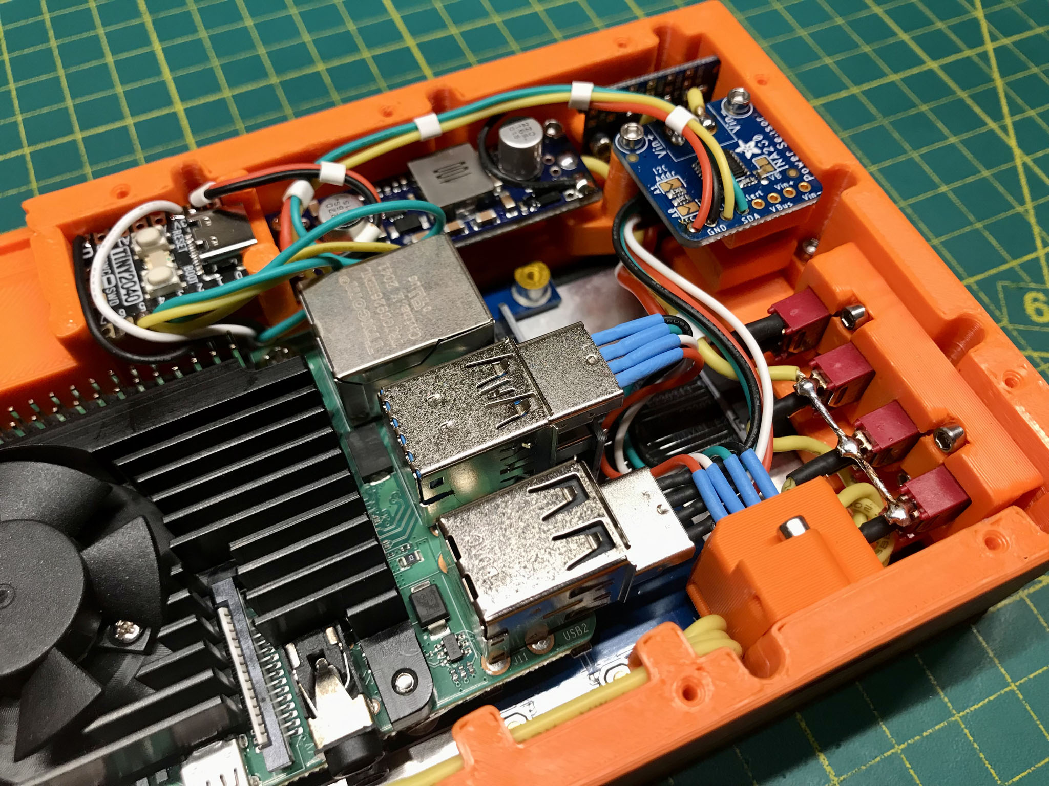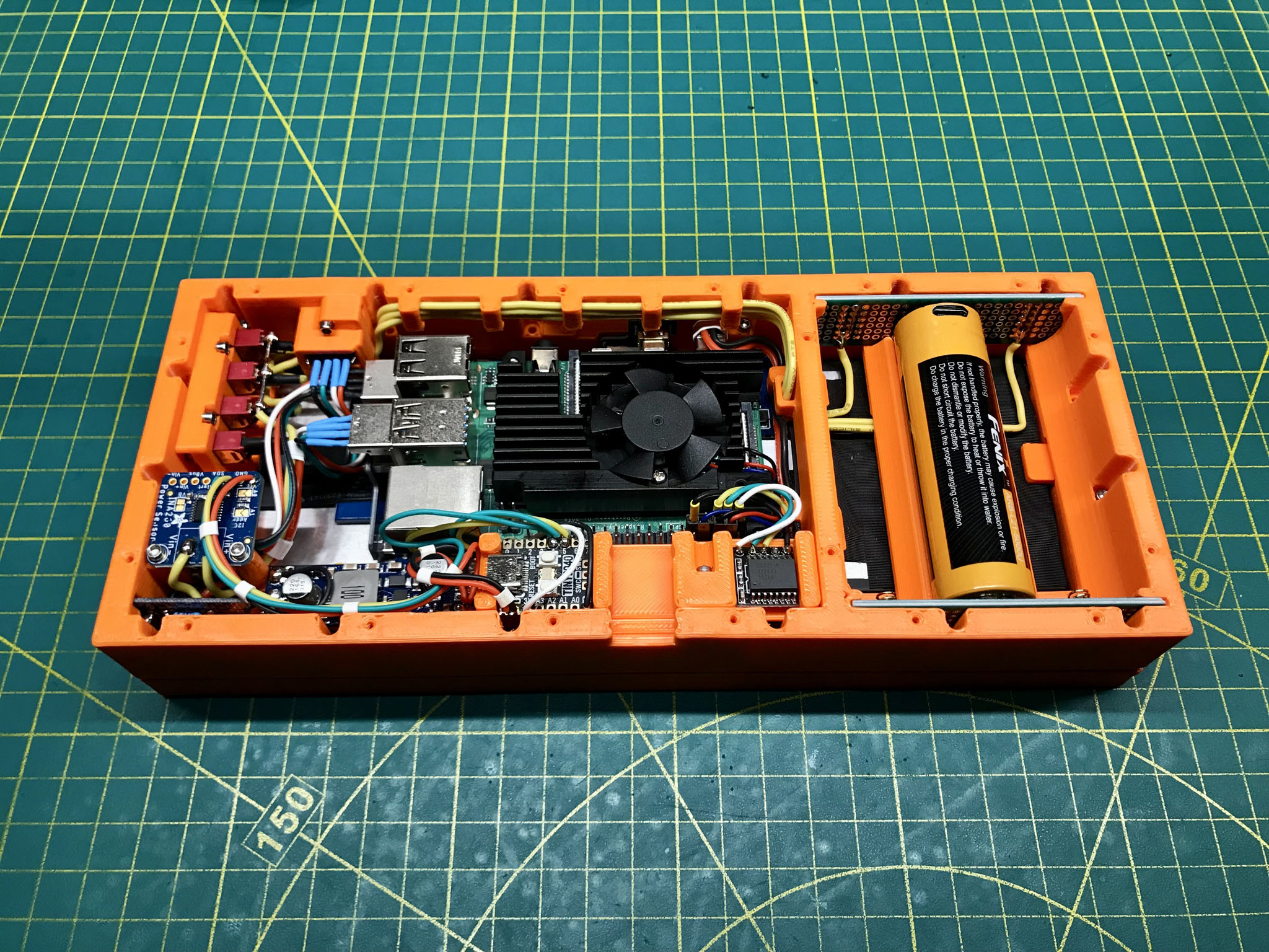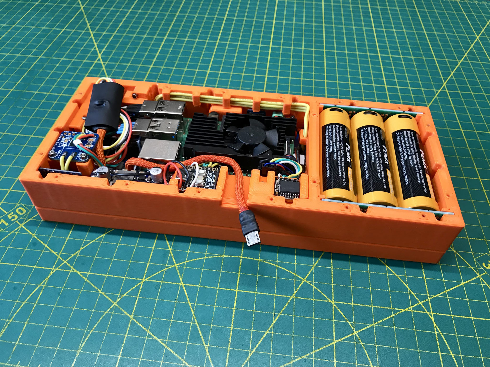Connectivity and access were designed to be practical, not minimal. The right panel puts the three battery switches, a master USB-C power switch, the Pi's microSD card slot, and a full-size USB-A port all within easy reach. Additional USB ports are positioned at the top and bottom edges of the case for peripherals like flash drives, mice, or serial adapters. Three USB-C charging connectors on the rear panel let you top up each battery independently — no need to remove them or shut down. Everything is reachable, nothing requires disassembly.
