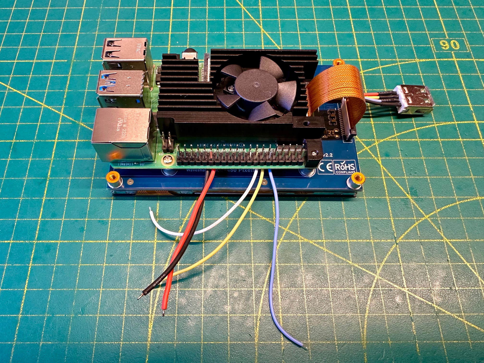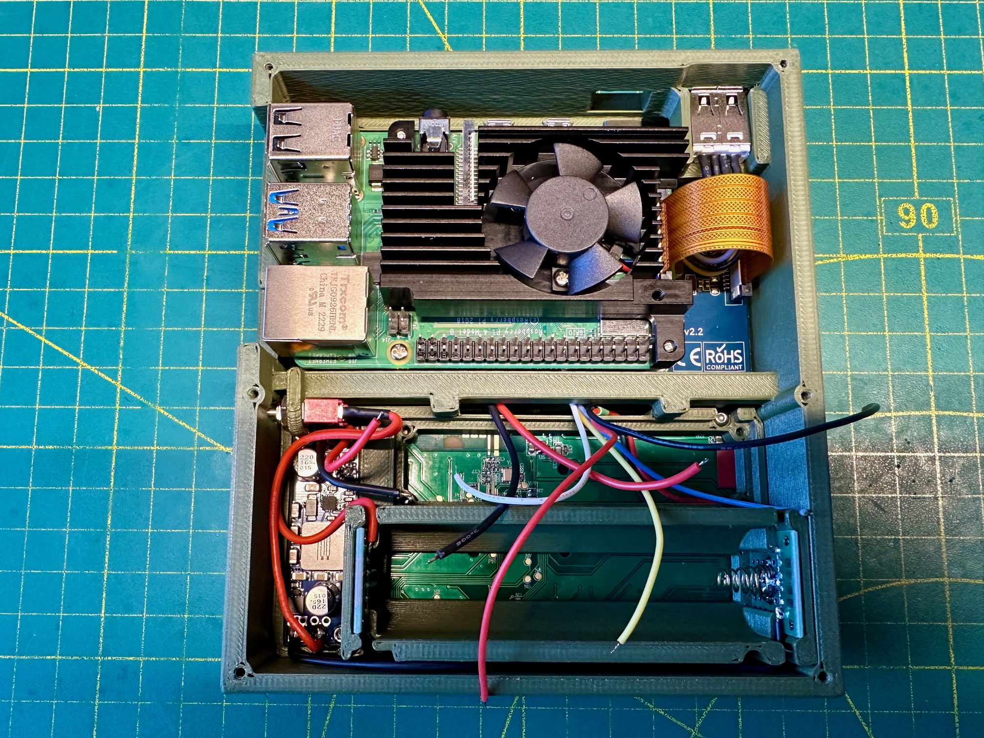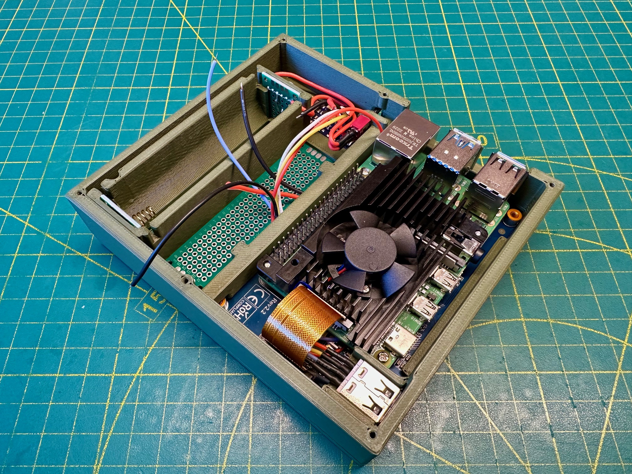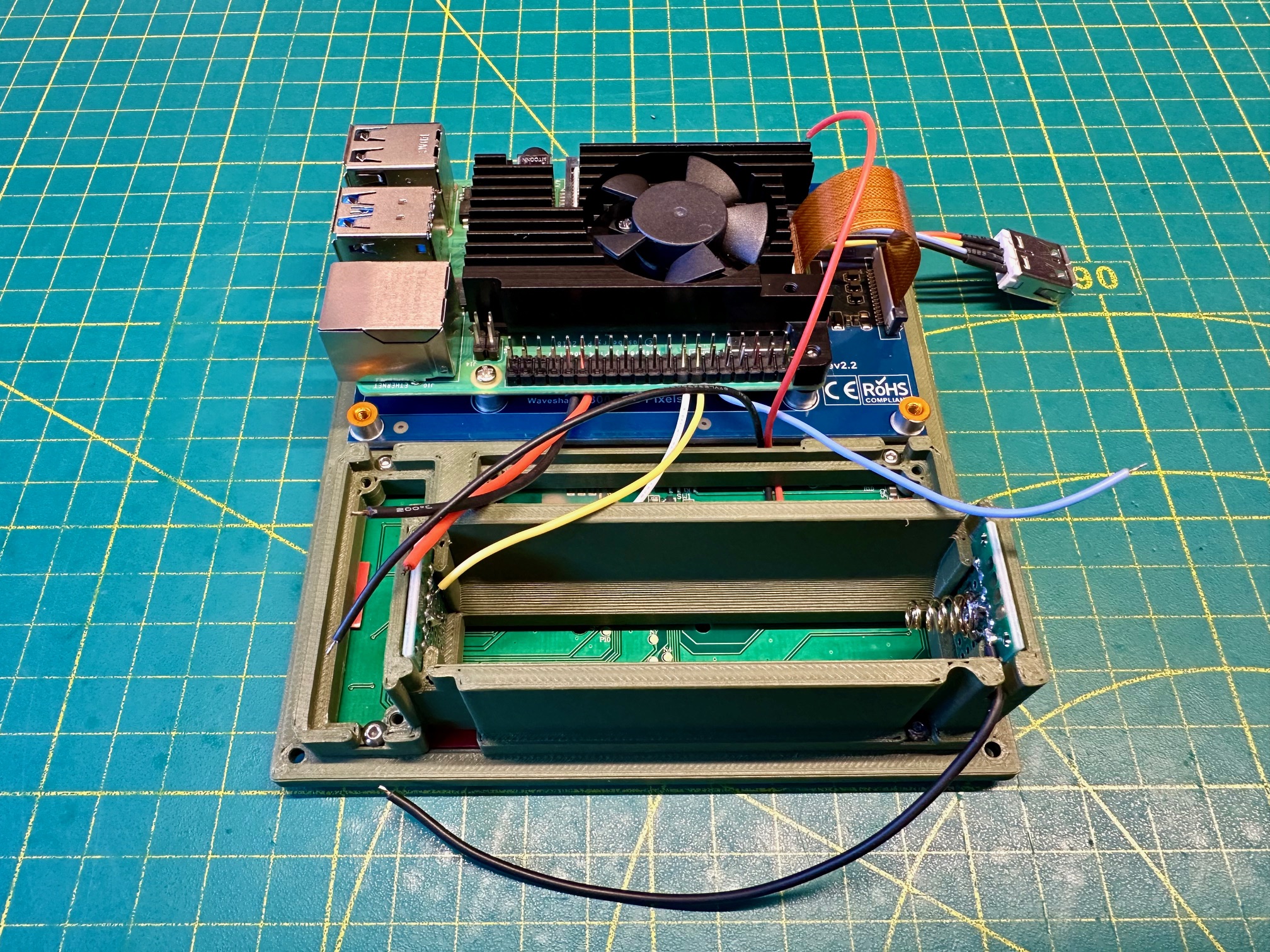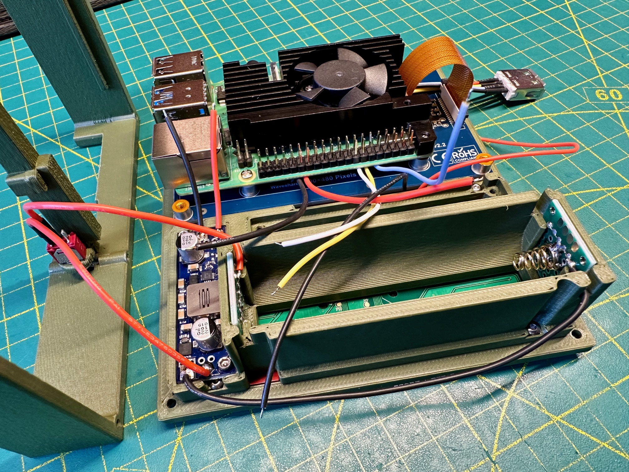 At the core is a Raspberry Pi 4B with significantly more headroom than the 3B+ in earlier handhelds. The quad-core Cortex-A72 and up to 4GB of RAM make multitasking genuinely usable — you can run Chromium, VS Code, and a terminal session without the system grinding to a halt. A full aluminum heatsink sits on the SoC, and a GPIO-controlled fan on pin 4 kicks in at 60°C to manage thermals inside the enclosed case. A DS3231 real-time clock module keeps accurate time between boots, so the device doesn't need a network connection just to know what day it is. The display is a compact touchscreen panel that runs the full Raspberry Pi desktop stack, rotated and configured for handheld use.