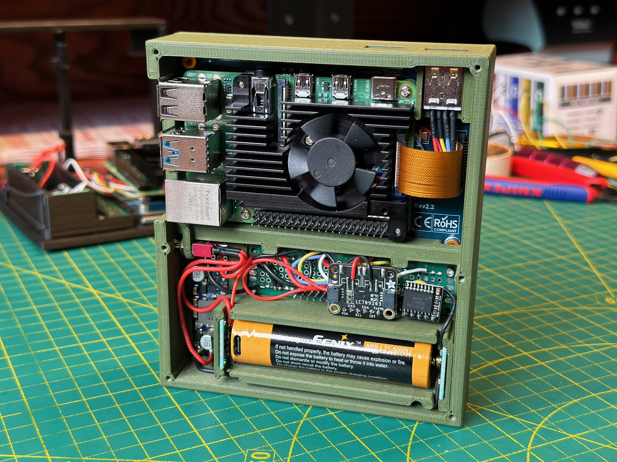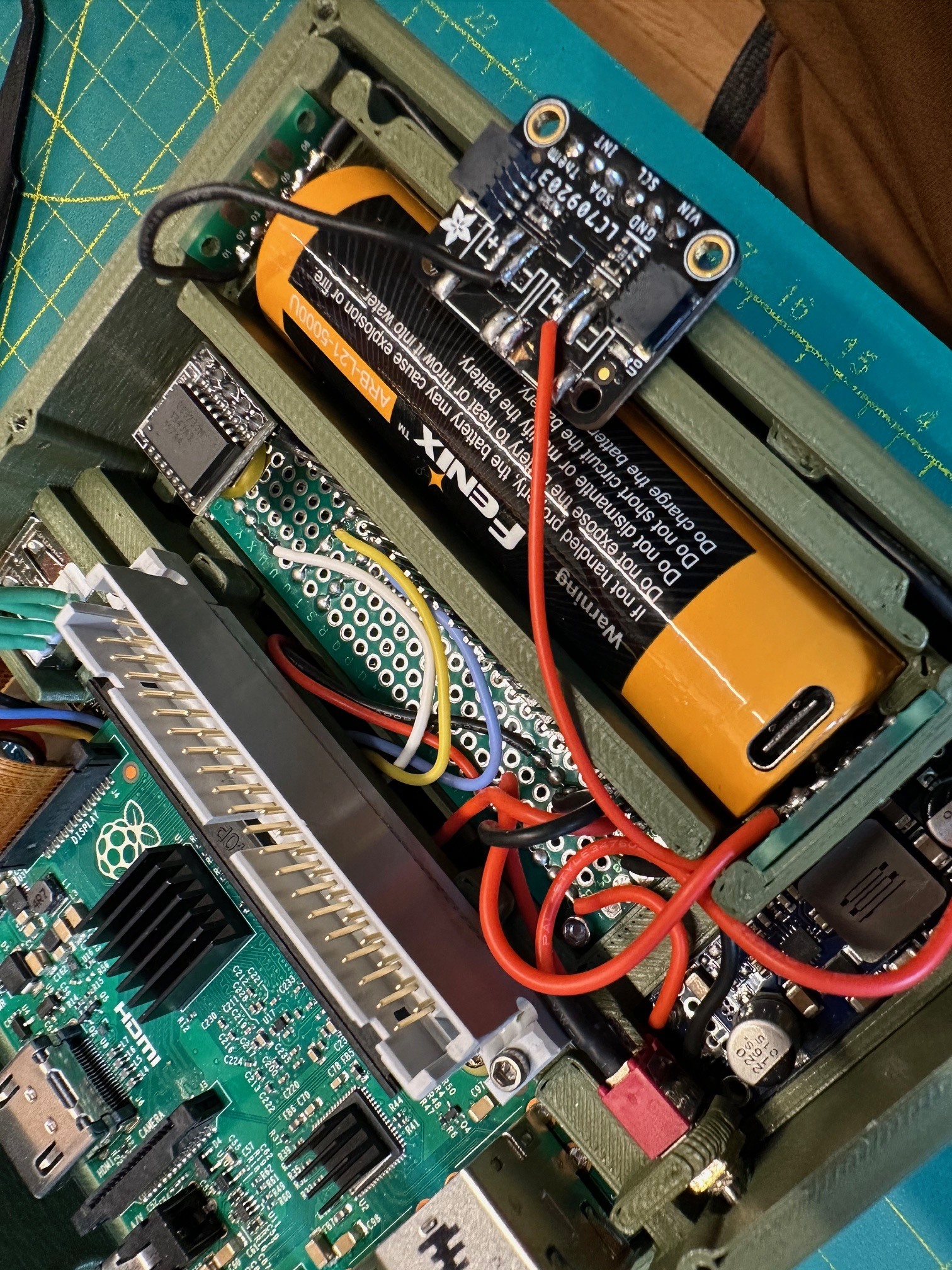 The M4 uses a custom battery monitoring system built around the Adafruit LC709203F fuel gauge connected over I2C. The software has two parts: a Linux kernel module that creates a virtual battery device at /dev/integrated_battery, and a C++ userspace service that reads voltage and charge percentage from the LC709203F and writes the data to the kernel module every 5 seconds. This makes the battery appear as a native Linux power supply — i3status, LXDE, and any other standard Linux battery indicator picks it up automatically.