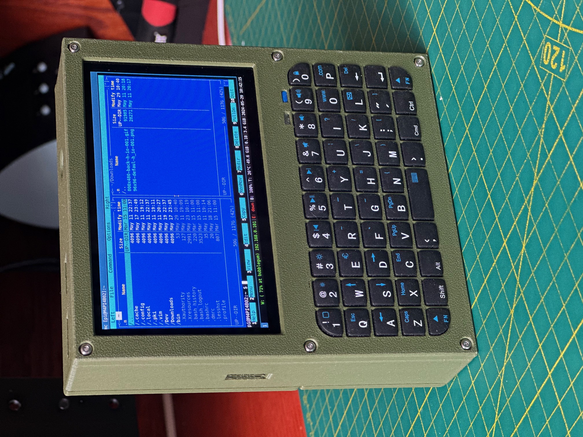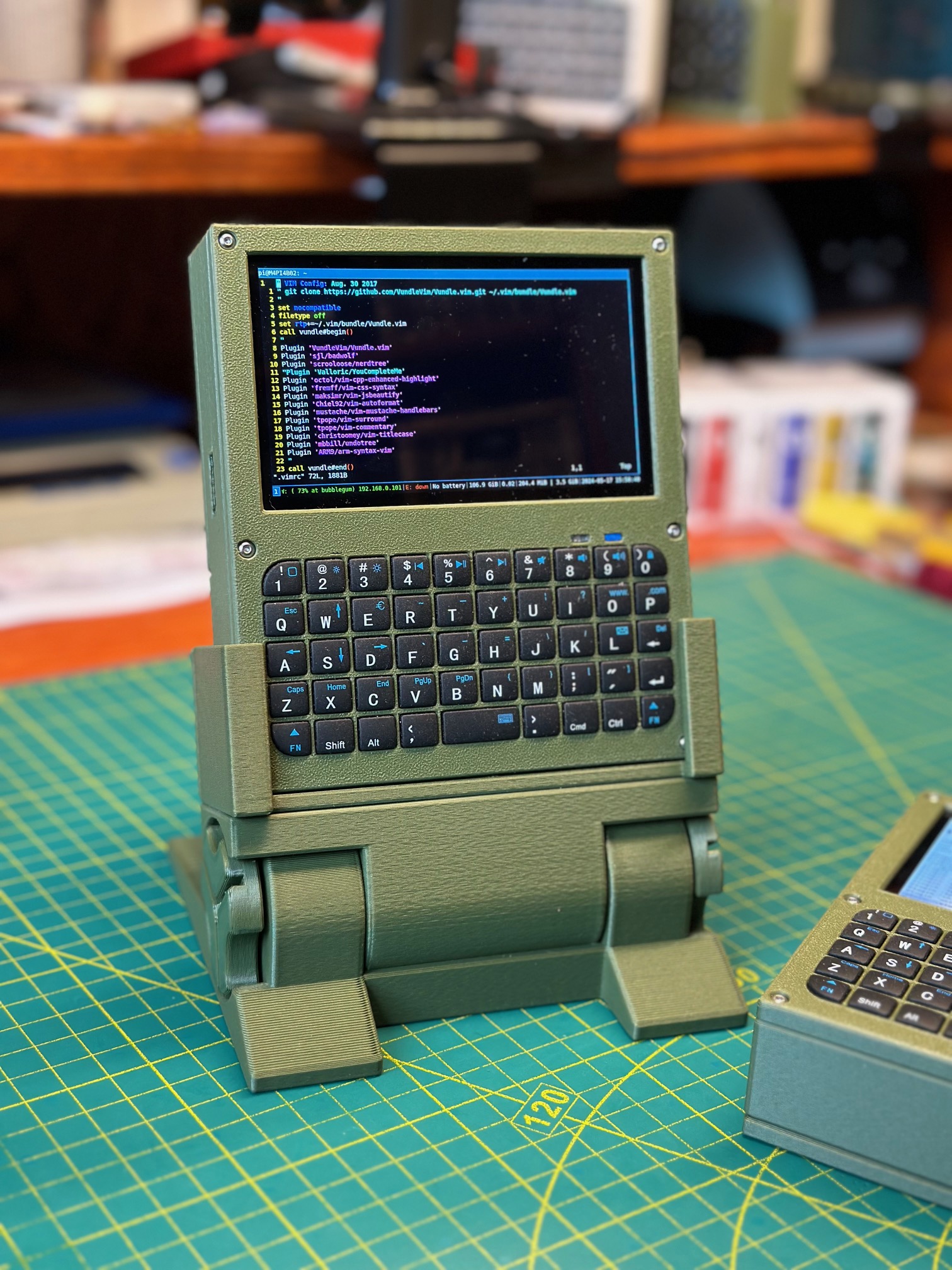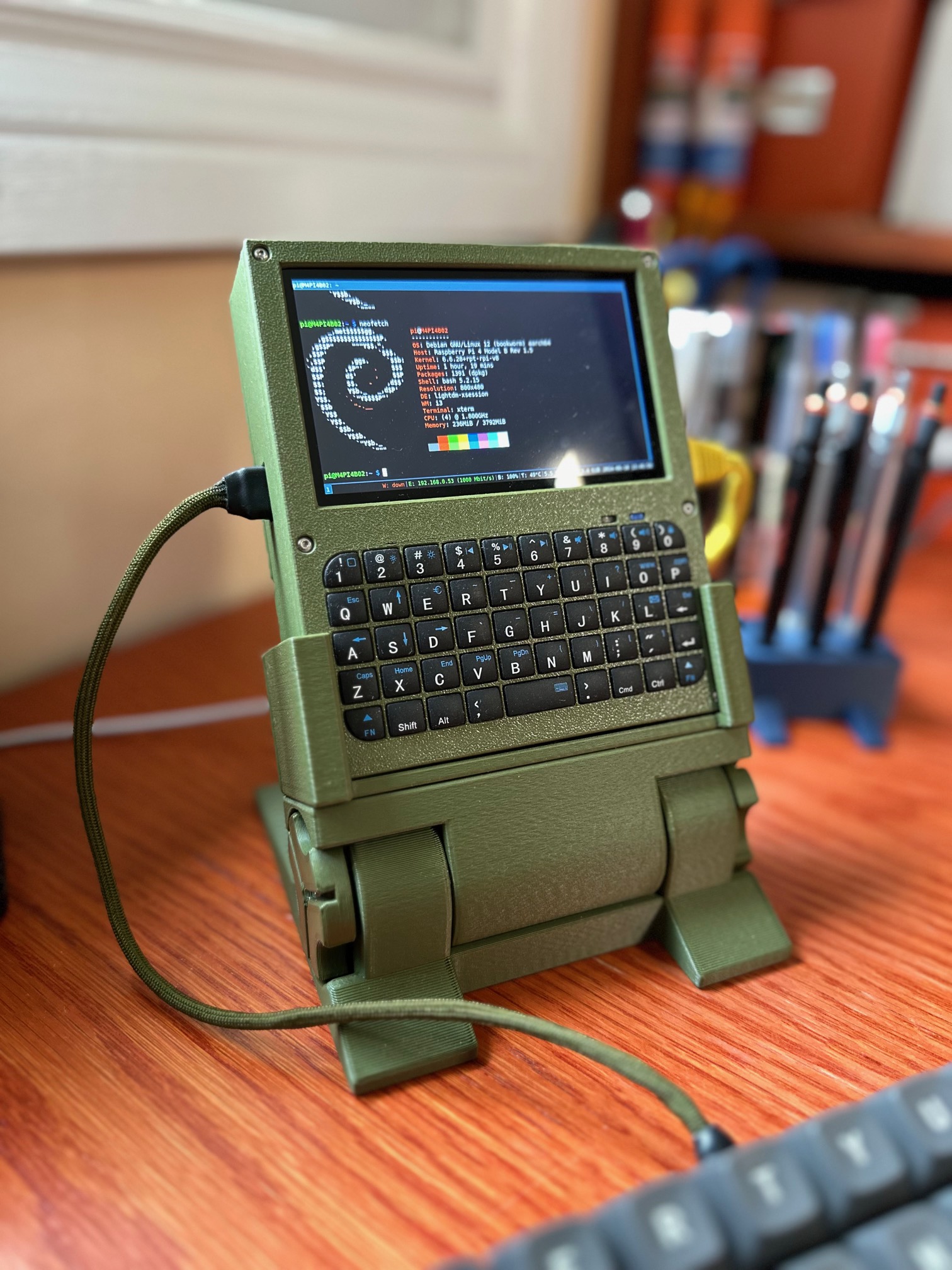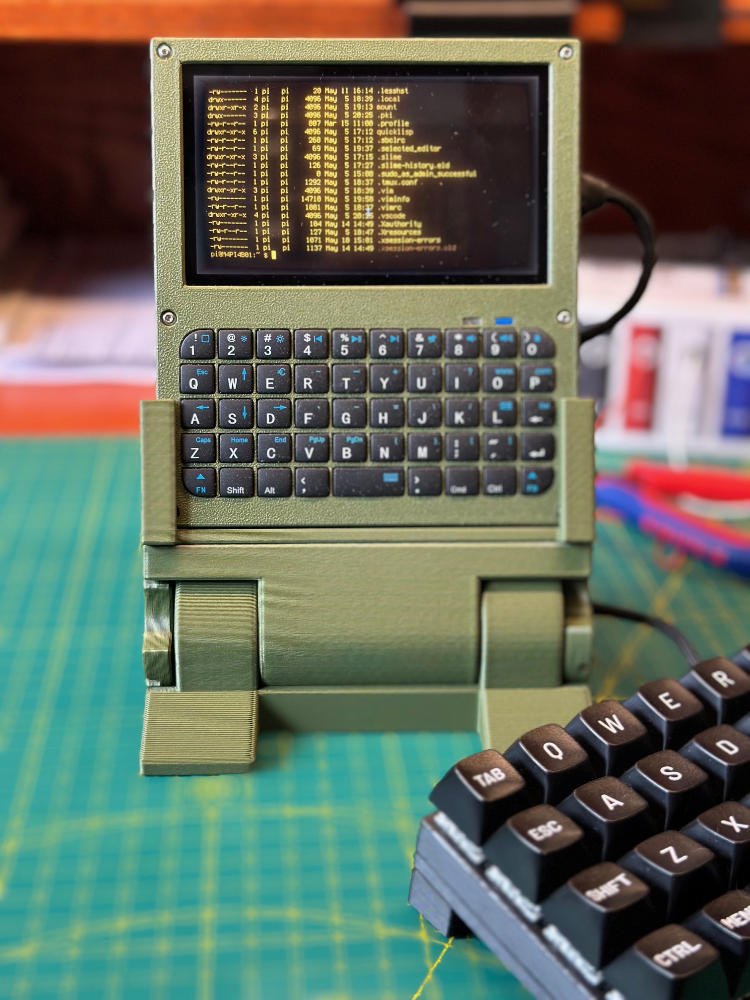 The entire enclosure is 3D-printed and held together with machine screws — nothing glued, nothing snapped into place. The olive green colorway gives it a utilitarian, almost military look that's grown into a signature of this build. The adjustable stand lets you prop the device at different viewing angles on a desk, and the whole thing is compact enough to slip into a cargo pocket or a small bag. The software stack is tailored for development work: Chromium for browsing, VS Code and Arduino IDE for coding, Emacs with SLIME for Common Lisp development via SBCL, Samba for network file sharing, and minidlna for serving media to other devices on the network.
