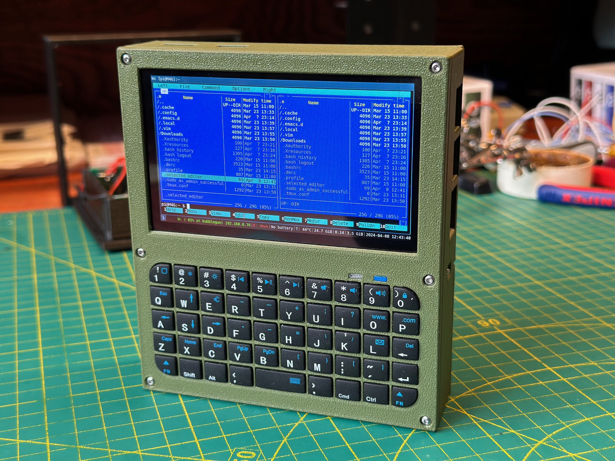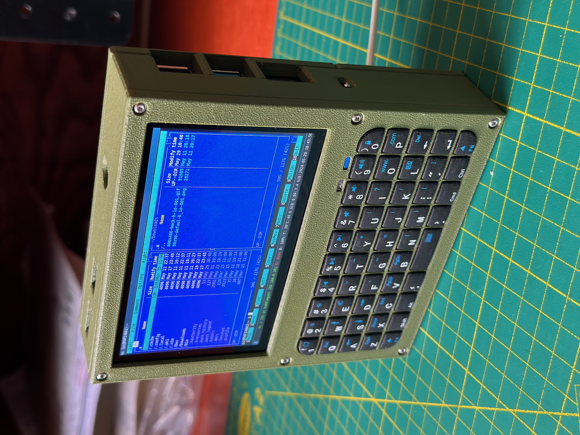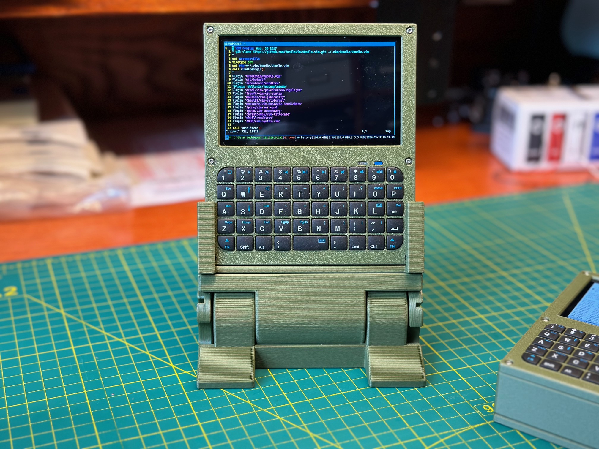 The entire enclosure is 3D-printed and held together with machine screws — nothing glued, nothing snapped into place. The olive green colorway gives it a utilitarian, almost military look that's grown into a signature of this build. The adjustable stand lets you prop the device at different viewing angles on a desk, and the whole thing is compact enough to slip into a cargo pocket or a small bag. The software stack is tailored for development work: Chromium for browsing, VS Code and Arduino IDE for coding, Emacs with SLIME for Common Lisp development via SBCL, Samba for network file sharing, and minidlna for serving media to other devices on the network.