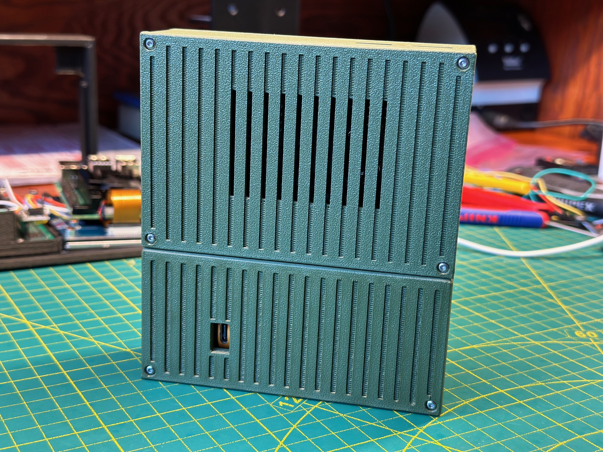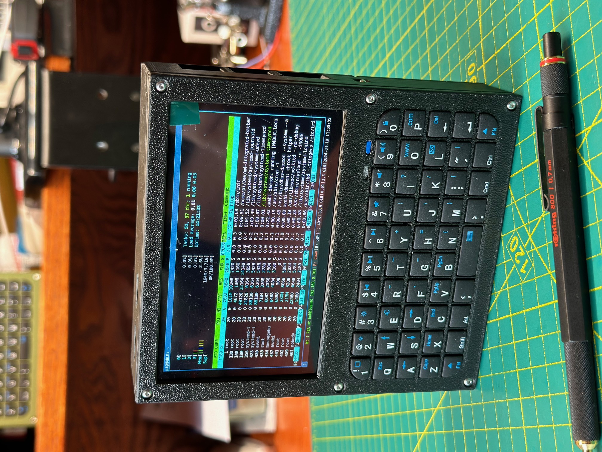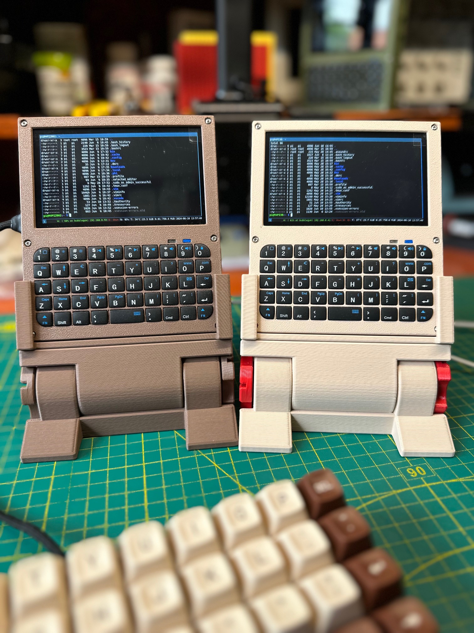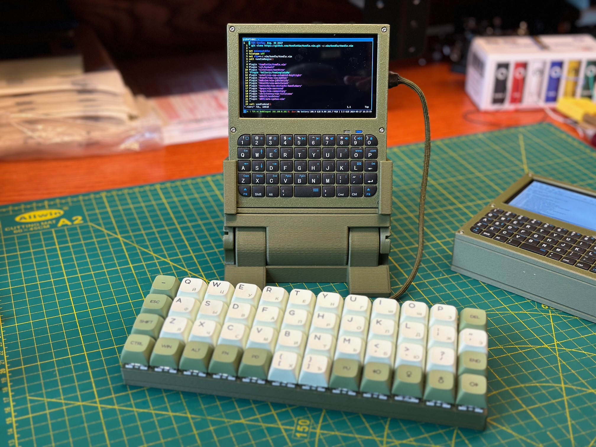 The entire enclosure is 3D-printed and held together with machine screws — nothing glued, nothing snapped into place. The olive green colorway gives it a utilitarian, almost military look that's grown into a signature of this build. The adjustable stand lets you prop the device at different viewing angles on a desk, and the whole thing is compact enough to slip into a cargo pocket or a small bag. The software stack is tailored for development work: Chromium for browsing, VS Code and Arduino IDE for coding, Emacs with SLIME for Common Lisp development via SBCL, Samba for network file sharing, and minidlna for serving media to other devices on the network.