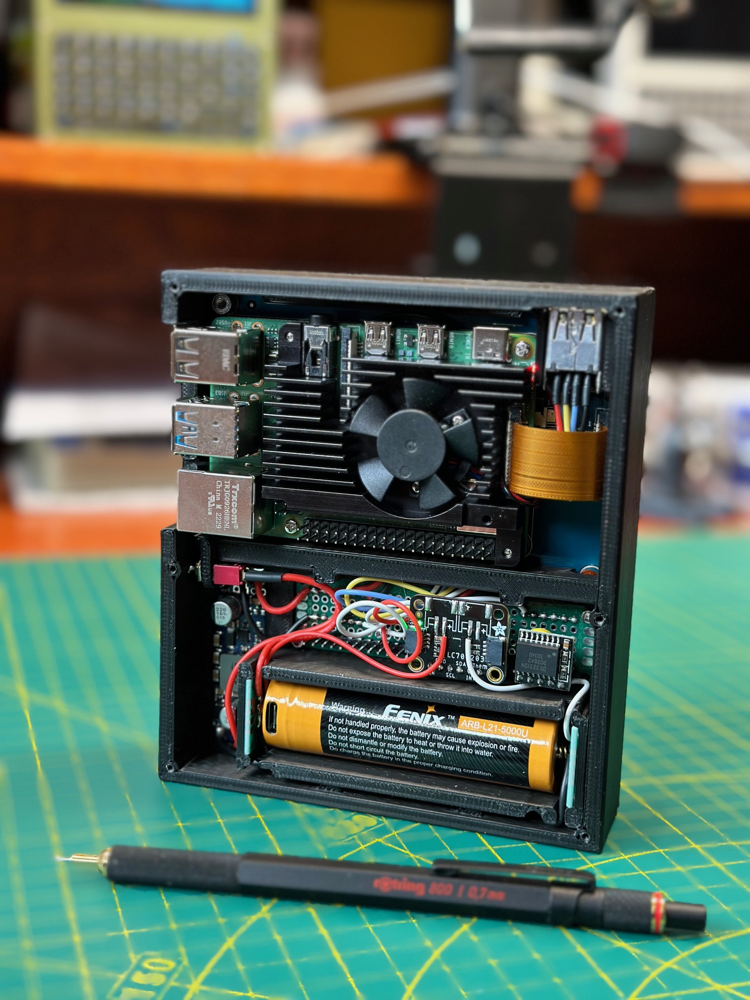 The M4 is where the YARH.IO handheld concept finally came together. Earlier builds proved that a pocket-sized Linux device was possible, but the Pi 4B is the first model that strikes the right balance between performance and power draw — fast enough to run a browser, an IDE, and background services simultaneously, yet efficient enough to deliver four to five hours of real use on a single charge. That runtime isn't a lab number with the screen dimmed and Wi-Fi off; it's actual working time with Chromium open, code compiling, and Bluetooth connected. The Pi 5 exists and it's faster, but this project deliberately uses the Pi 4B — its lower power consumption fits the form factor, the cooling, and the battery capacity in a way the Pi 5 simply can't match. A Pi 5 would drain the battery in under two hours and need active cooling that doesn't fit in a handheld shell. The Pi 4B is the sweet spot: powerful enough for real work, efficient enough to make a portable device that actually lasts. The result is a handheld that you reach for instead of a laptop — not because it replaces one, but because for most tasks it's all you need and it's already in your pocket.