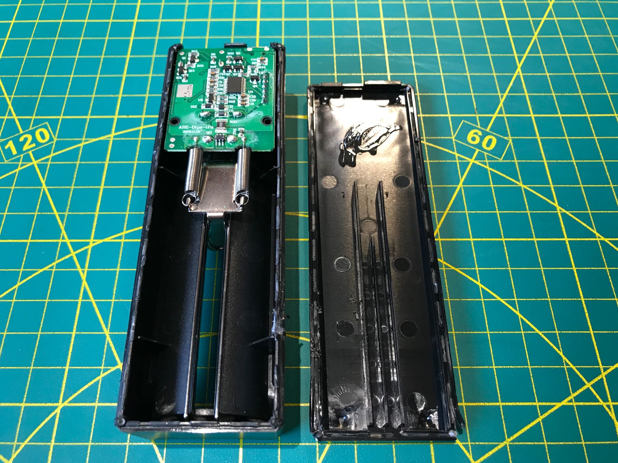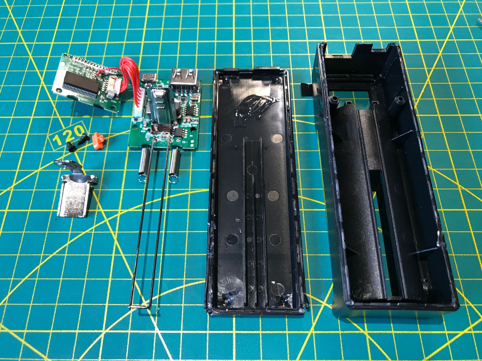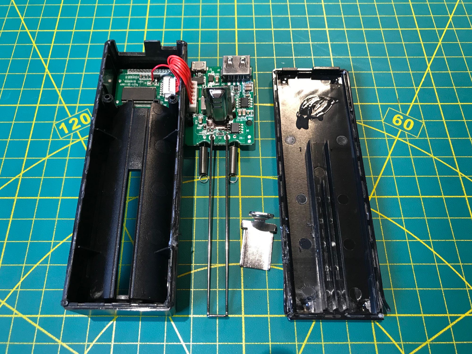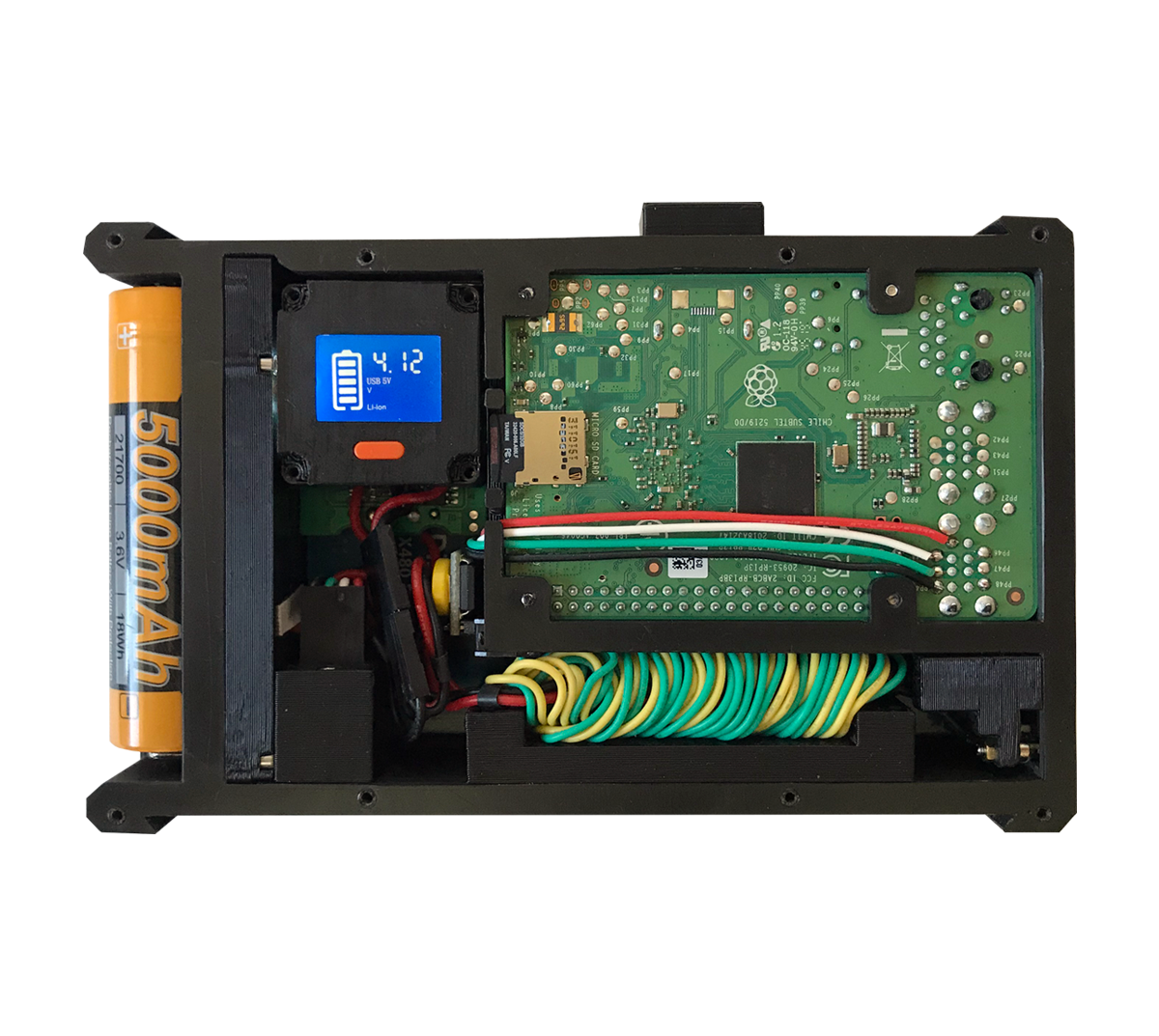 Power comes from a single removable Fenix ARB-L21-5000 lithium-ion cell — 5000 mAh in a standard 21700 form factor. The battery slides out for quick swaps in the field. Charging and 5V regulation use the internals of a Fenix ARE-D1 smart charger, mounted inside the housing. The Raspberry Pi 3B+ was chosen deliberately over the 4B for this build: lower power draw means longer runtime on a single cell, and the 3B+ provides more than enough compute for terminal work, scripting, and lightweight GUI tasks.