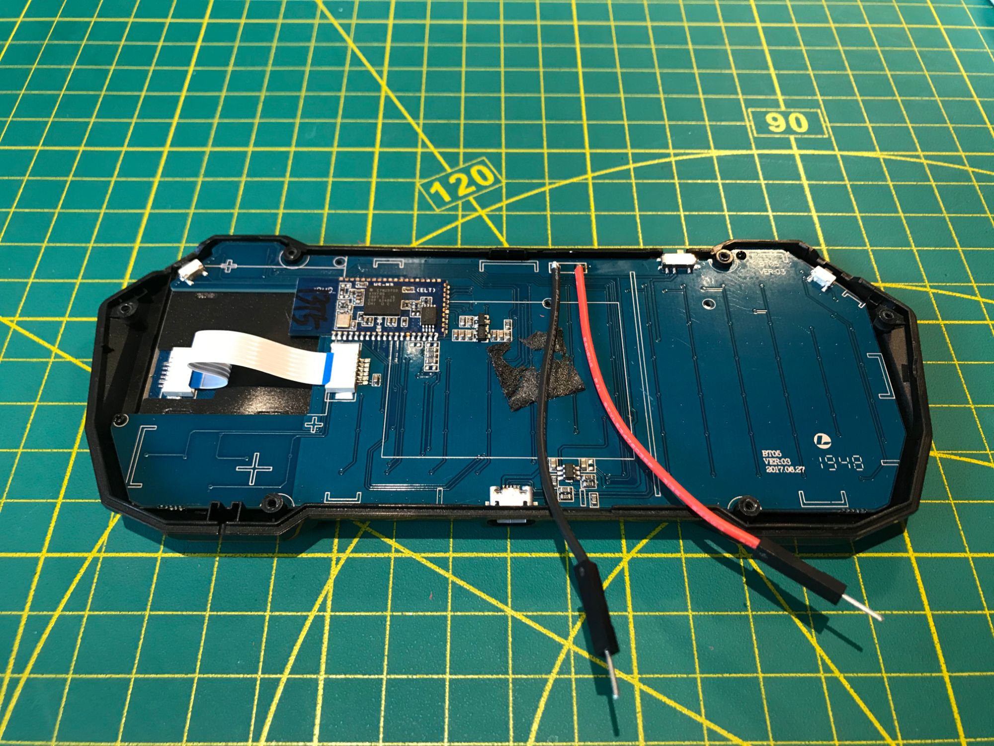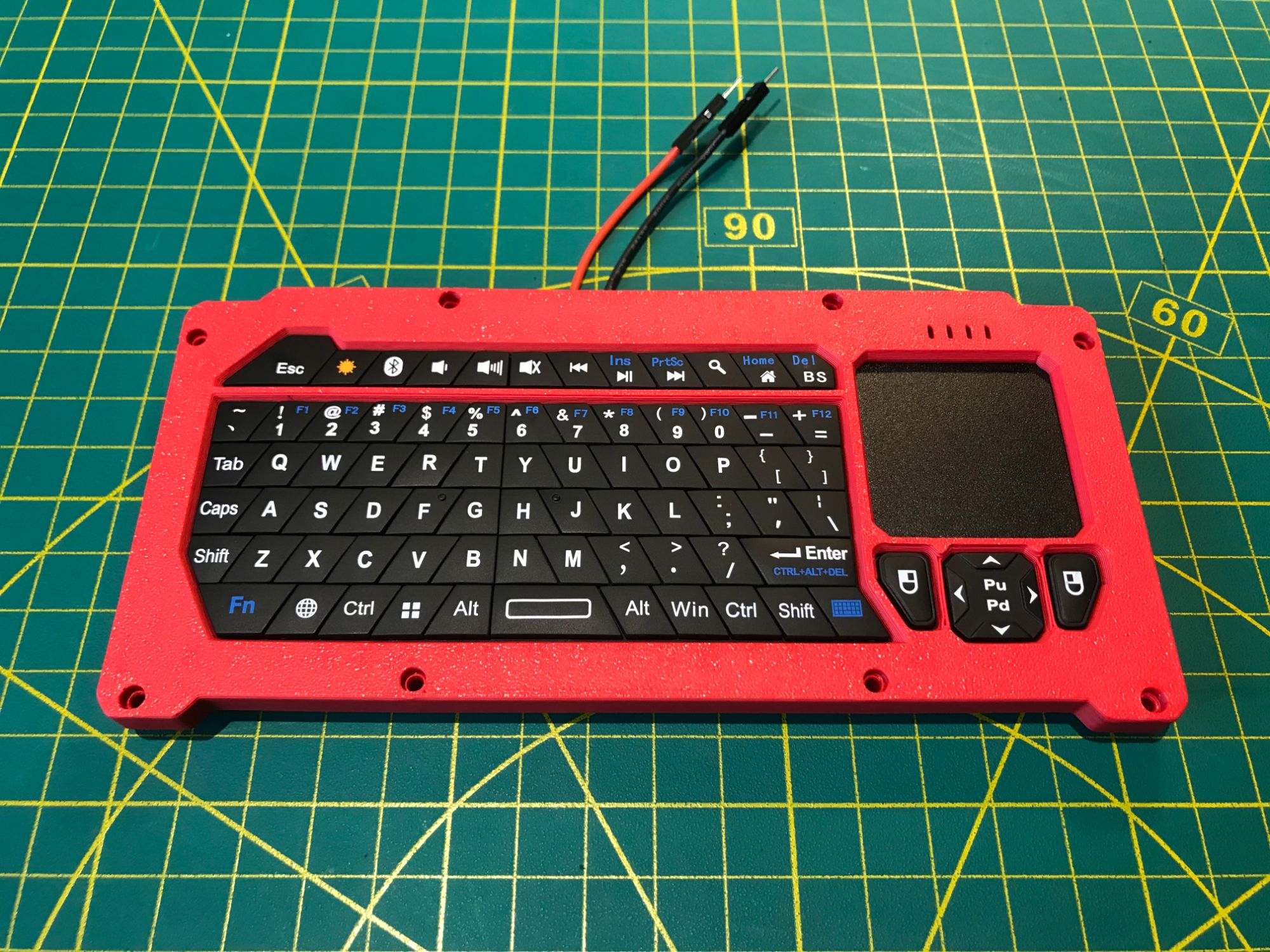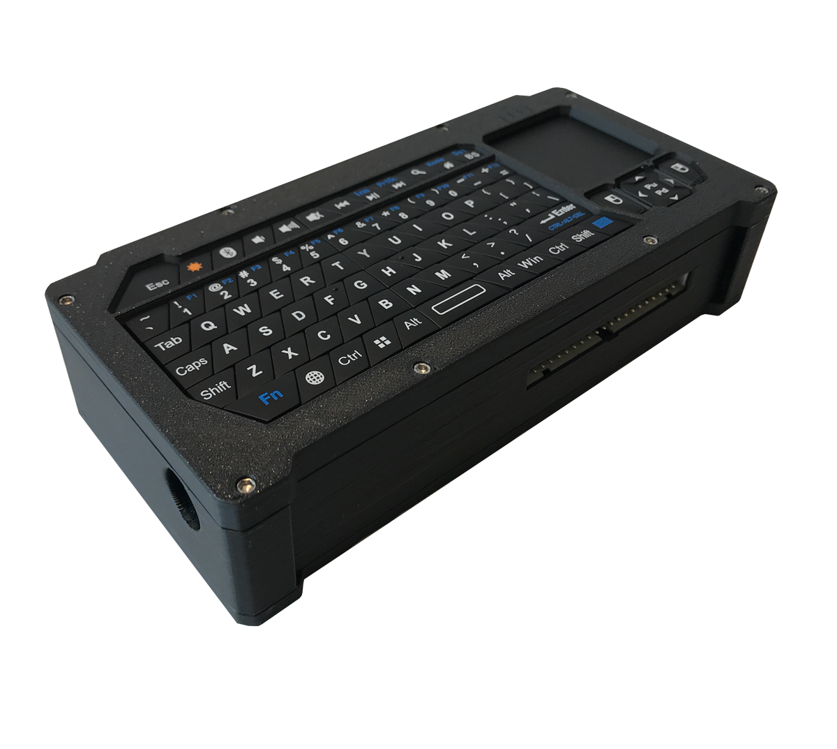 Input comes from a Fosmon portable Bluetooth keyboard with a built-in trackpad. The layout includes modifier keys for Vim, tmux, and Emacs workflows. The trackpad provides pointing capability for graphical applications and web browsing. Bluetooth pairing is done once through the system menu; on subsequent boots the keyboard reconnects automatically when you press Enter.