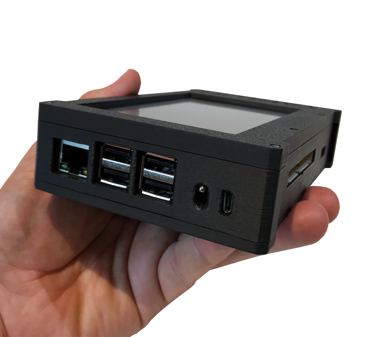 The display is a Kuman 5-inch resistive touch screen running at 800x480 over HDMI with an SPI-based ADS7846 touch controller. Resistive touch works with any stylus or gloved hand. The screen is large enough for terminal work, web browsing, and graphical applications without compromise. Touchscreen calibration is handled through xinput-calibrator and a persistent Xorg config file.